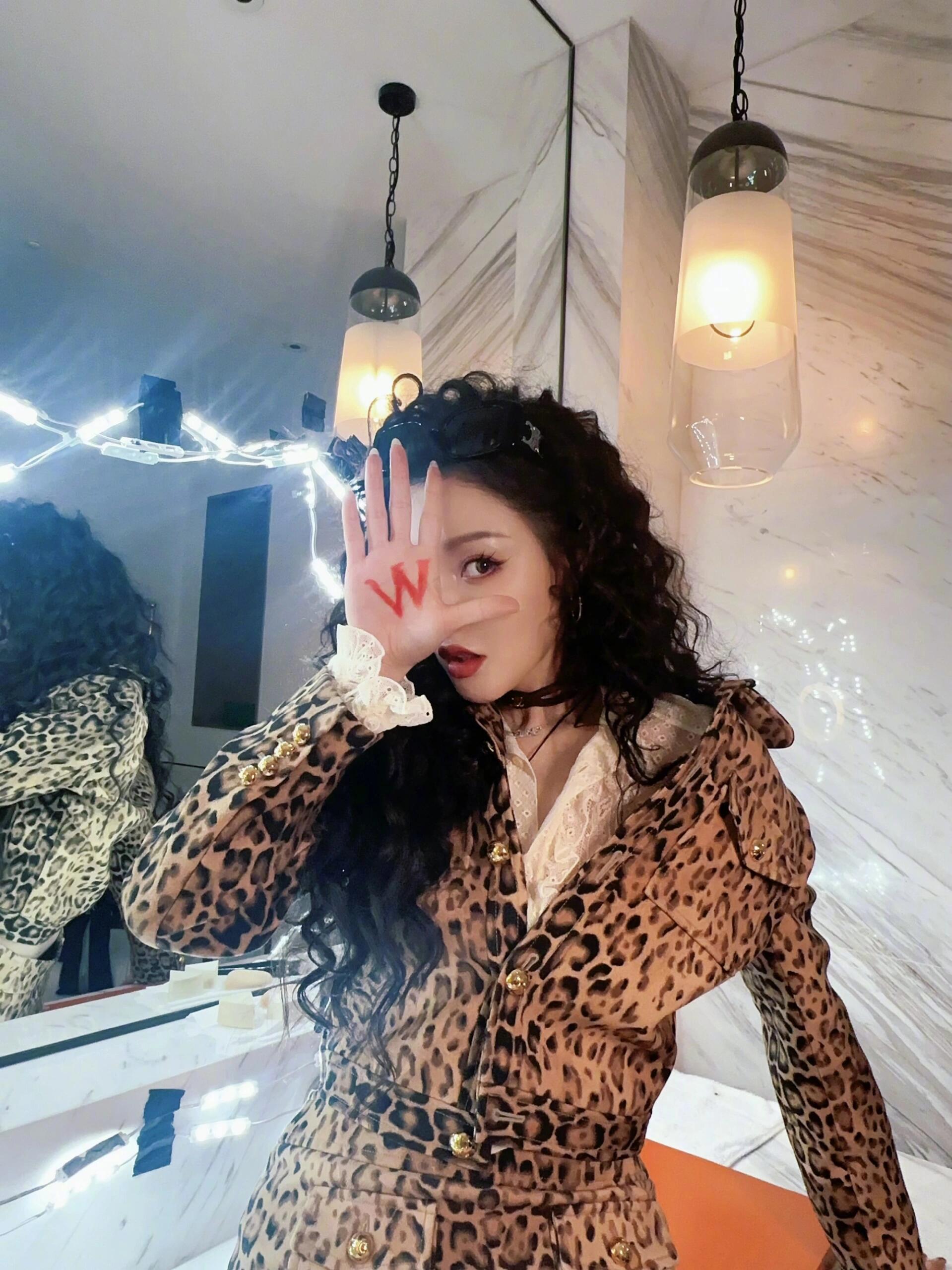 这个造型很酷。一头羊毛卷,一件驼色豹纹短外套,内搭白色蕾丝花边衬衫,配豹纹短裙,脚上穿黑色的短靴。帅气复古很有个性。