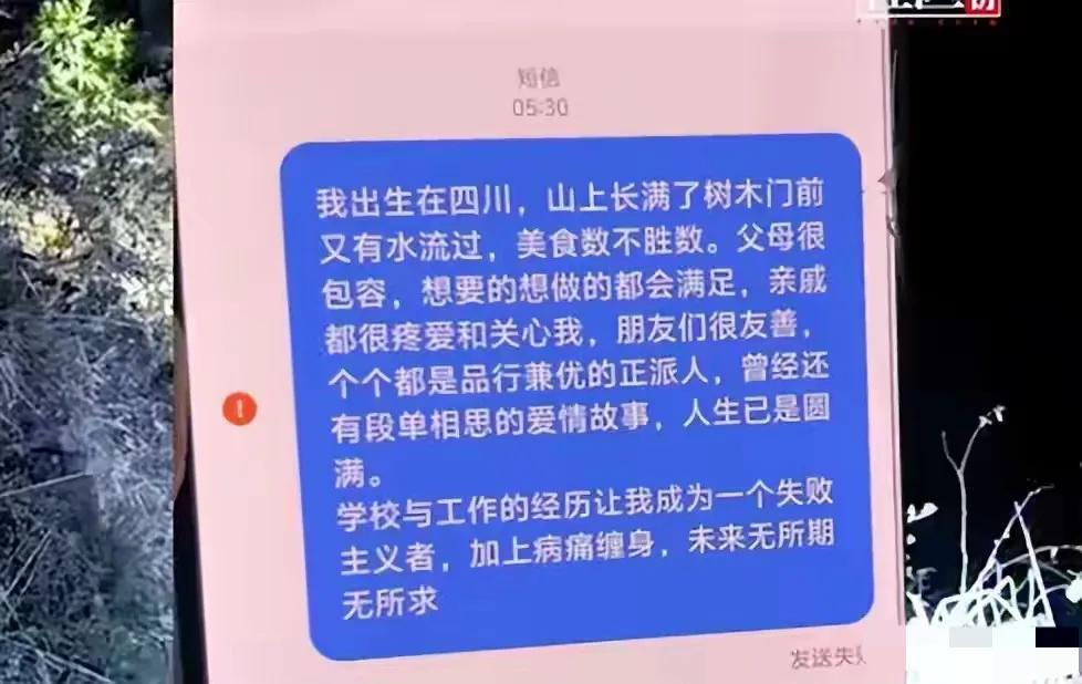 今年大年初一,他破天荒提出,要去亲戚家拜年,老两口高兴坏了,以为孩子想通了,要转性了,谁能想到,这哪里是去拜年,分明是他留给家人,最后的念想,是他在安排自己的后事啊,他把手机清空,只留下一条没发出去的草稿,把所有的决绝,都留给了自己。