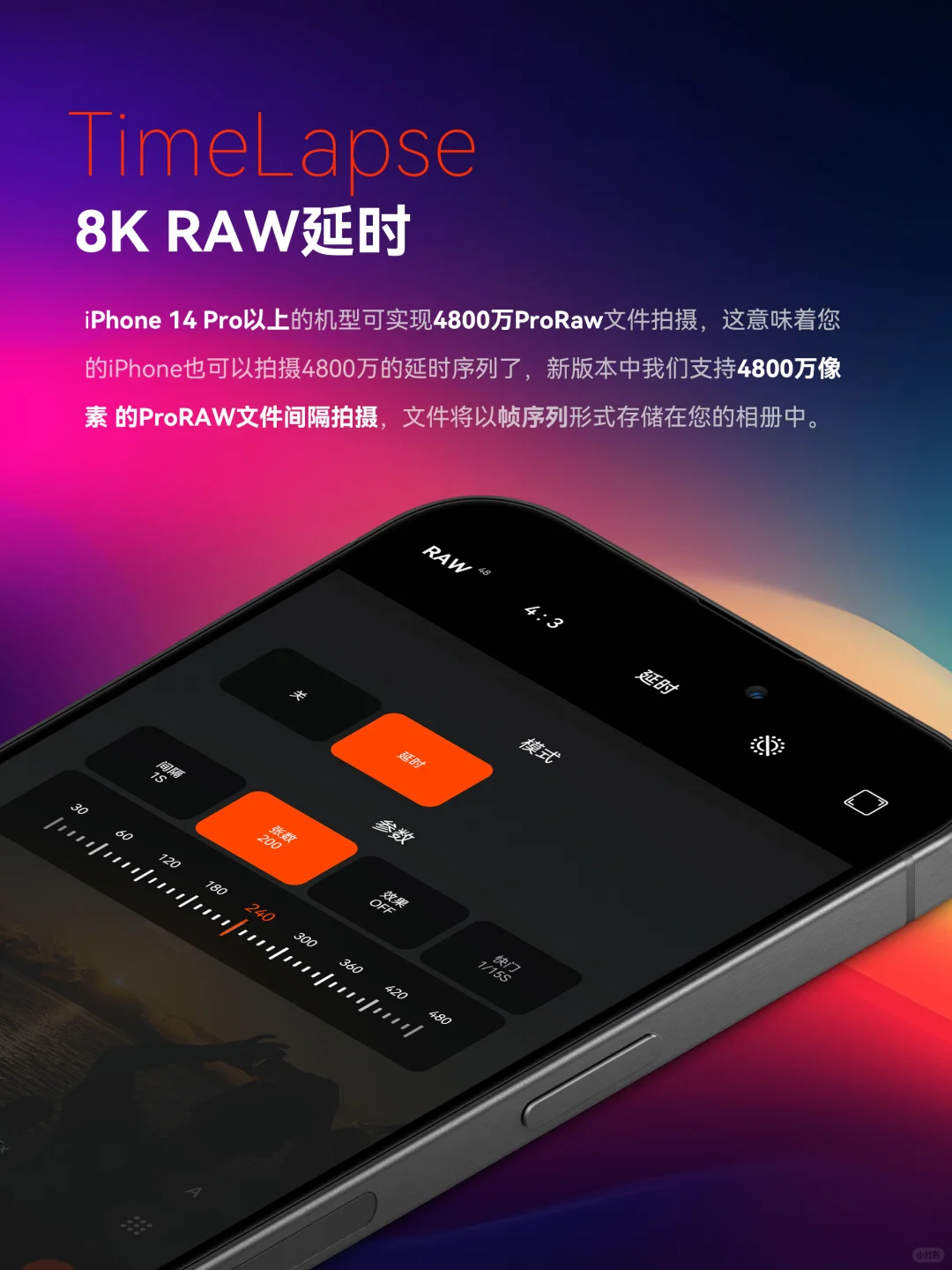 4.8K raw延时序列拍摄:iPhone 14 Pro以上的机型可实现4800万ProRaw文件拍摄,这意味着您的iPhone也可以拍摄4800万的延时序列了,新版本中我们支持4800万像素 的ProRAW文件间隔拍摄,文件将以帧序列形式存储在您的相册中。