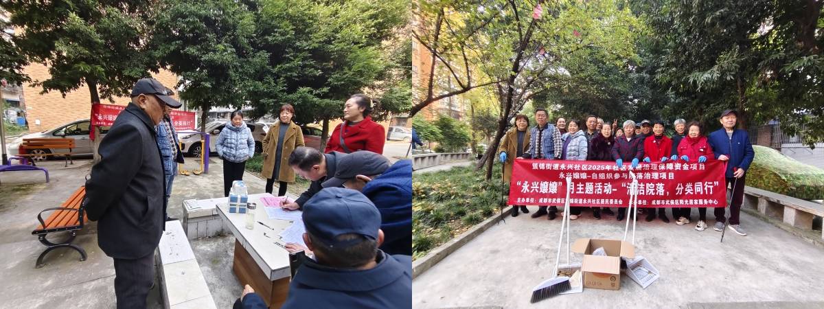 为深化文明院落创建,普及垃圾分类知识,引导居民养成绿色环保的生活习惯,2025年11月23日上午10:00至11:30,由成都市武侯区簇锦街道永兴社区2025年社区发展治理保障资金支持,簇锦街道永兴社区居民委员会主办,成都市武侯区阳光居家服务中心承办的永兴嬢嬢-自组织参与院落治理项目-“永兴嬢嬢”月主题活动第14期—“清洁院落,分类同行”活动在铁佛名苑A区开展。“永兴嬢嬢”自组织队伍成员与铁佛名苑居民志愿者共计16人携手参与,以实际行动清洁家园、传递环保理念,让文明新风浸润院落每个角落。