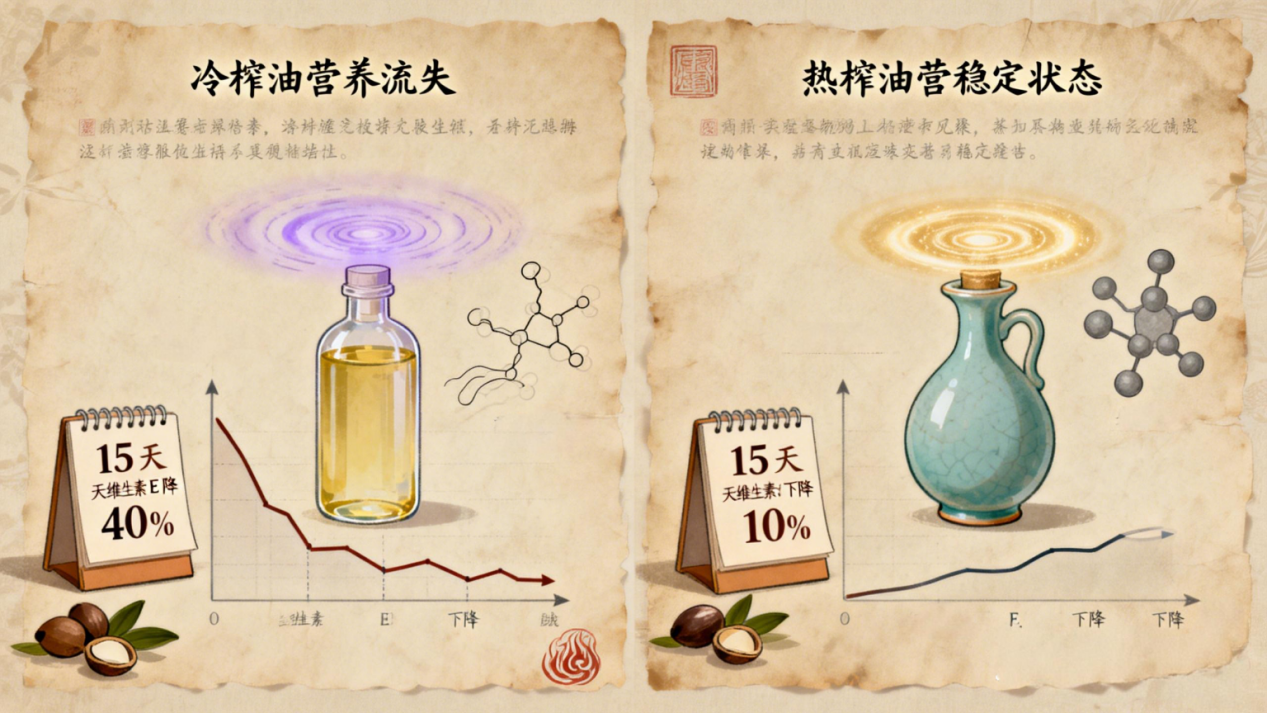 冷榨幻觉的本质,是把“未完成的化学状态”包装成“天然优势”。 一个还在发生化学反应的物质,怎么可能是健康的?“营养保留”的谎言:成分多≠健康你可能听过“冷榨油含更多维生素E、不饱和脂肪酸”的说法,但真相是:这些成分在冷榨油中极不稳定。实验数据显示,冷榨橄榄油开封后,维生素E含量在15天内下降40%,而热榨油仅下降10%。原因很简单:冷榨油没有经过高温熟化,无法终止植物自身的氧化体系,营养成分刚出厂就开始流失。健康的油脂标准从来不是“成分越多越好”,而是“成分越稳定越好”。热榨过程中的高温,恰恰是让油脂“成熟”的关键——它灭活了酶,稳定了脂肪酸结构,让营养成分能安全到达人体并被吸收。热榨才是油脂的“成人礼”:稳定才是健康的关键从植物逻辑到人体逻辑:热榨的必要性中国传统饮食智慧早就告诉我们“油要熟”。热榨的过程,就是让油脂从“植物的生命状态”转化为“人体的食物状态”: