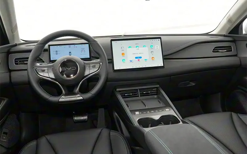 海豹06漂亮的外观内饰设计也非常抢眼,与秦L采用同平台打造,采用全液晶仪表盘和15.6英寸大尺寸中控屏幕设计,换挡区域采用了圆形设计,小巧的拨杆挡把看起来十分精致,内饰质感也不错。