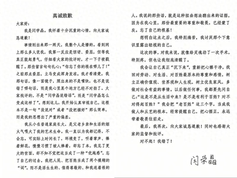 不过一封电子版的道歉信,都不是手写的,文末只签了一个名,难免让人质疑闫学晶的态度不够诚恳。