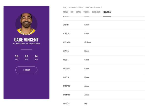 在美国basketball-reference数据网站的DBPM(每百回合防守影响力)方面,文森特以-1.6评分在湖人队内排名倒数第4,仅领先小尼克-史密斯-2.5、八村塁-2.1、克内克特-2,整体防守效率惨不忍睹.