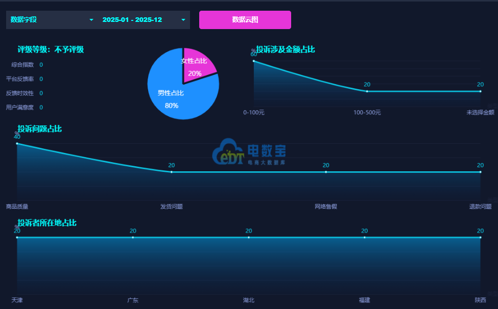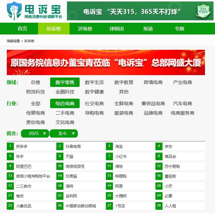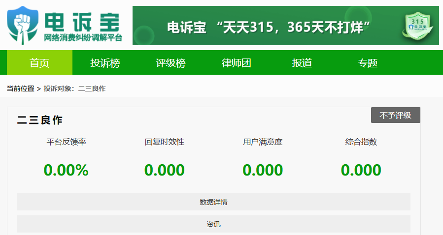 2025年至今,“电诉宝”受理投诉中综合电商领域用户有效投诉显示(依据投诉量排行),“二三良作”排名第17位,最新评级为“不予评级”。除此之外,其他被投诉的类似平台还有:拼多多、抖音电商、淘宝、京东、快手、天猫、小红书、唯品会、阿里巴巴、微信视频号、得物、苏宁易购、微信小程序购物平台、交易猫、哔哩购、蘑菇街、淘特、网易、小芒、卷皮、返利网、大槐树、必要、小象优品、中国移动移动商城、1号店、人人租。