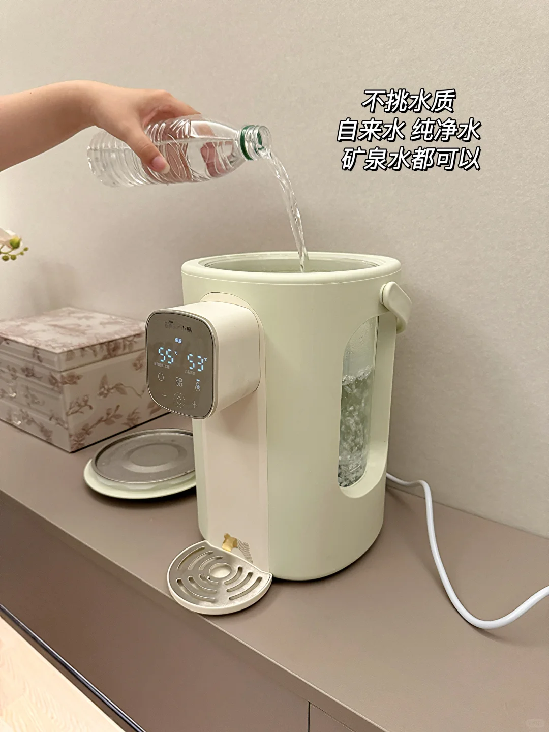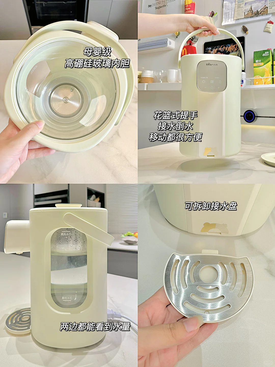 以前想喝杯温水,烧完水各种折腾。用保温瓶里面的水不是烫的要命,就是变成了隔夜凉水。 终于被我找到了这台小熊风精灵电热水瓶。✨ 这个电热水瓶和普通的烧水壶还真不一样。1300W的大功率,烧水速度更快,还自带360°循环风冷技术可以加速降温,比传统烧水壶降温快87%。水沸腾后,内置的风冷系统就能快速将水温降到设定好的温度再自动保温。既保证了每滴水都是熟水,还不用自己摊凉,真的实现凉白开不久等,超方便。 还是母婴级高硼硅玻璃内胆,健康安全,烧水没有异味。做了可视窗设计,两边都能看到水量,还带提手,这样加水倒水都很方便。3.6L的容量刚好适合两三个人一天的用水量,再也不用担心水喝不完变成隔夜水浪费了。 并且他有三种煮水模式不挑水质,自来水还能安全除氯。最近秋季干燥,晚上把它放在卧室,小体积也不占位置,还有小夜灯,起夜喝水也方便。 9寸大触屏,操作也很简单。有12档水温和6档水量可以自由调节,无论是55度的小杯蜂蜜水还是95度的大碗泡面都能一键get。 有了这个小熊风精灵电热水瓶,这下终于实现凉白开自由了。居家幸福感大大提高~