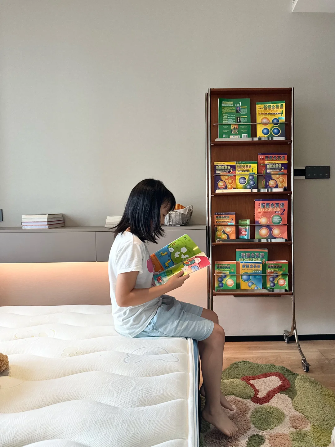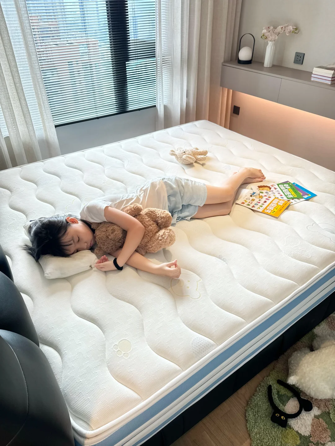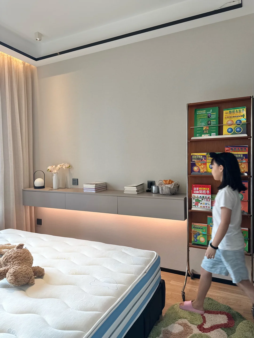 儿童房也布置好了,心里建设也做了,可是晚上一关灯一关房门就说怕。半夜还会跑主卧来睡🤦‍♀ 实在于心不忍,所以把主卧简单布置了下。 铺了草地地毯也放了书架。为了她能睡的舒服,把床垫也换成了儿童床垫。 这次我选择的是上海之恋 KID+儿童床垫,我选择这款的原因是: 📕首先,它有权威检测机构检验,防螨抗菌无异味,而且是0 胶水的用着比较安心。 🛏其次,它有精准的七区独立袋装弹簧,能为身体的每个部位提供支撑力,更好地保护孩子的脊椎健康,孩子也能睡的更舒服。 🌟再者,它的面料很亲肤,面层还可拆下来,就再也不怕小孩把床垫弄脏了。定期丢洗衣机晾晒清理一下,干净又卫生。 💖最后,它有百日免费试睡,喜欢又有顾虑的姐妹们也都可以试一试。我当初就是抱着试试的心态,没想到收到很惊喜,娃也特别喜欢,每天在床上蹦蹦跳跳,睡的也很安心。 为了让孩子睡好觉,有安全感,我们决定暂时还是不强迫症她分床睡了。