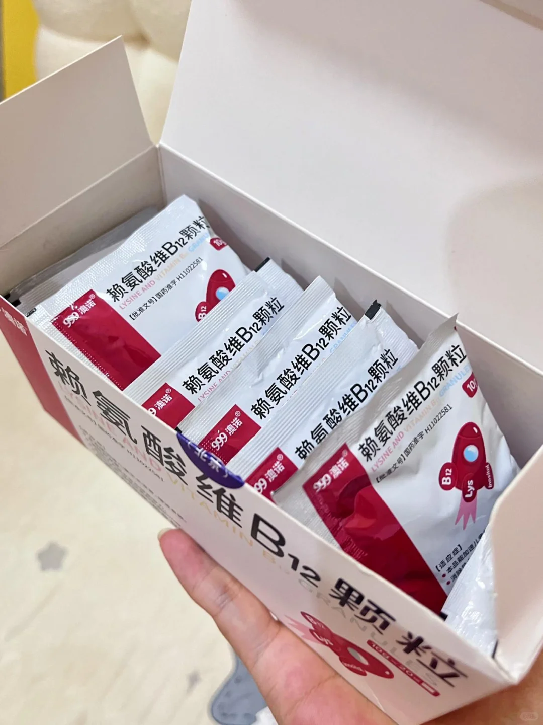后来去医院体检的时候,医生建议我给宝宝补充一些赖氨酸维B12,说可以帮助宝宝不挑食、又能增强体质,促进生长发育。我回家后做了很多功课,最后选择了999澳诺的赖氨酸维B12颗粒。它的口感也很好,味道香甜,宝宝很喜欢喝。