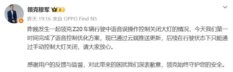 2月26日晚,领克汽车销售有限公司副总经理穆军发文回应,将事件定性为“行驶中语音误操作控制关闭大灯”,并表示已通过云端推送优化方案,后续在行驶状态下,大灯只能通过手动控制关闭。