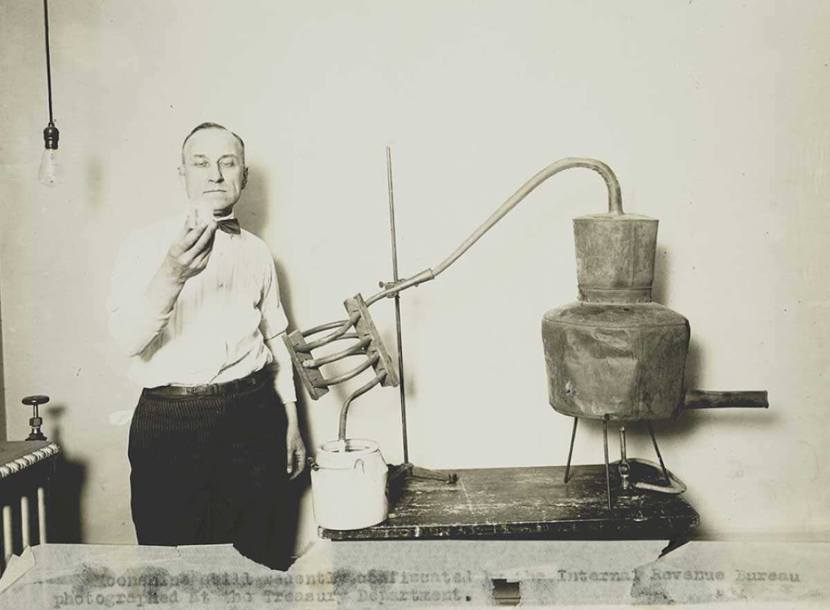 1921—1932年,美国国税局查抄的私酿酒蒸馏器,拍摄于财政部大楼,藏于美国国会图书馆。