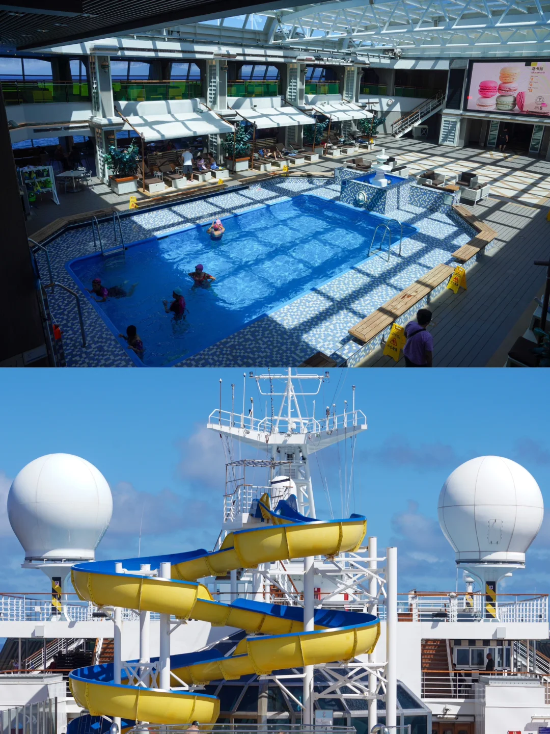 娱乐篇:船上有3个海水泳池和1条滑水梯道,室内泳池上面有玻璃天花阻挡紫外线,因为海水浮力大,游泳挺轻松的;