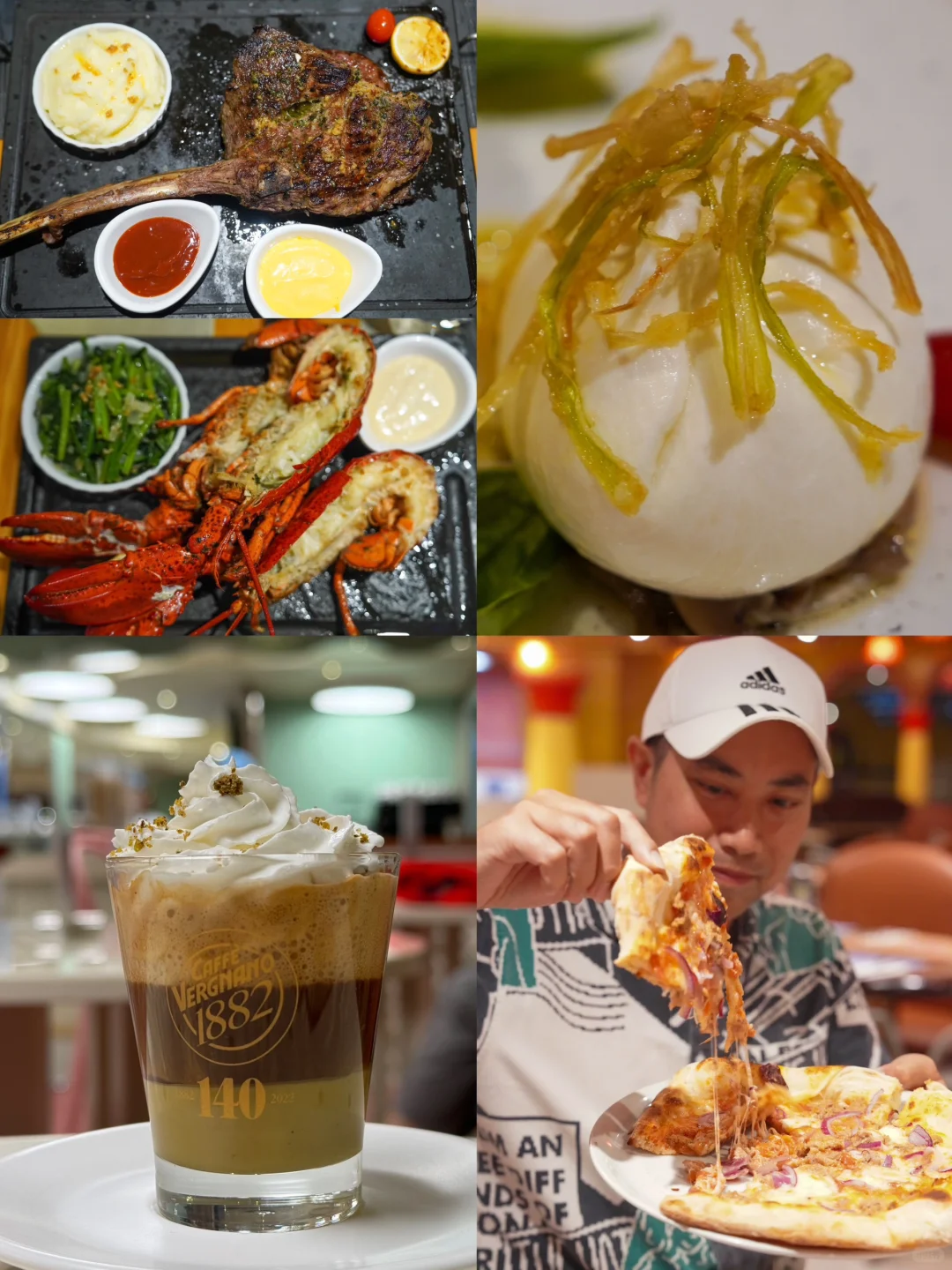 特色餐厅需要自费,海上牛排屋,战斧牛扒,份量足,肉嫩好吃;想体验正宗的意大利比萨,推荐到10层的意式餐厅,还有他们家的布法拉齐佐纳奶酪是用意大利纯正黄牛奶发酵制作的,配上黑胡椒拉里、干番茄、橄榄和火箭水拉,感觉得挺特别的,推荐。