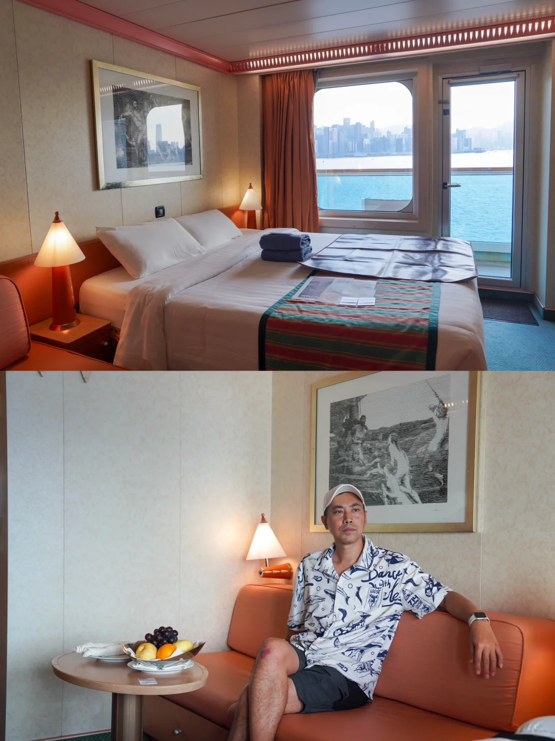 住宿篇:船共有1500间房,套房、内舱房、海景房和阳台房都有,我这次入住的是海景阳台房,甲板6层,视频挺好的。
