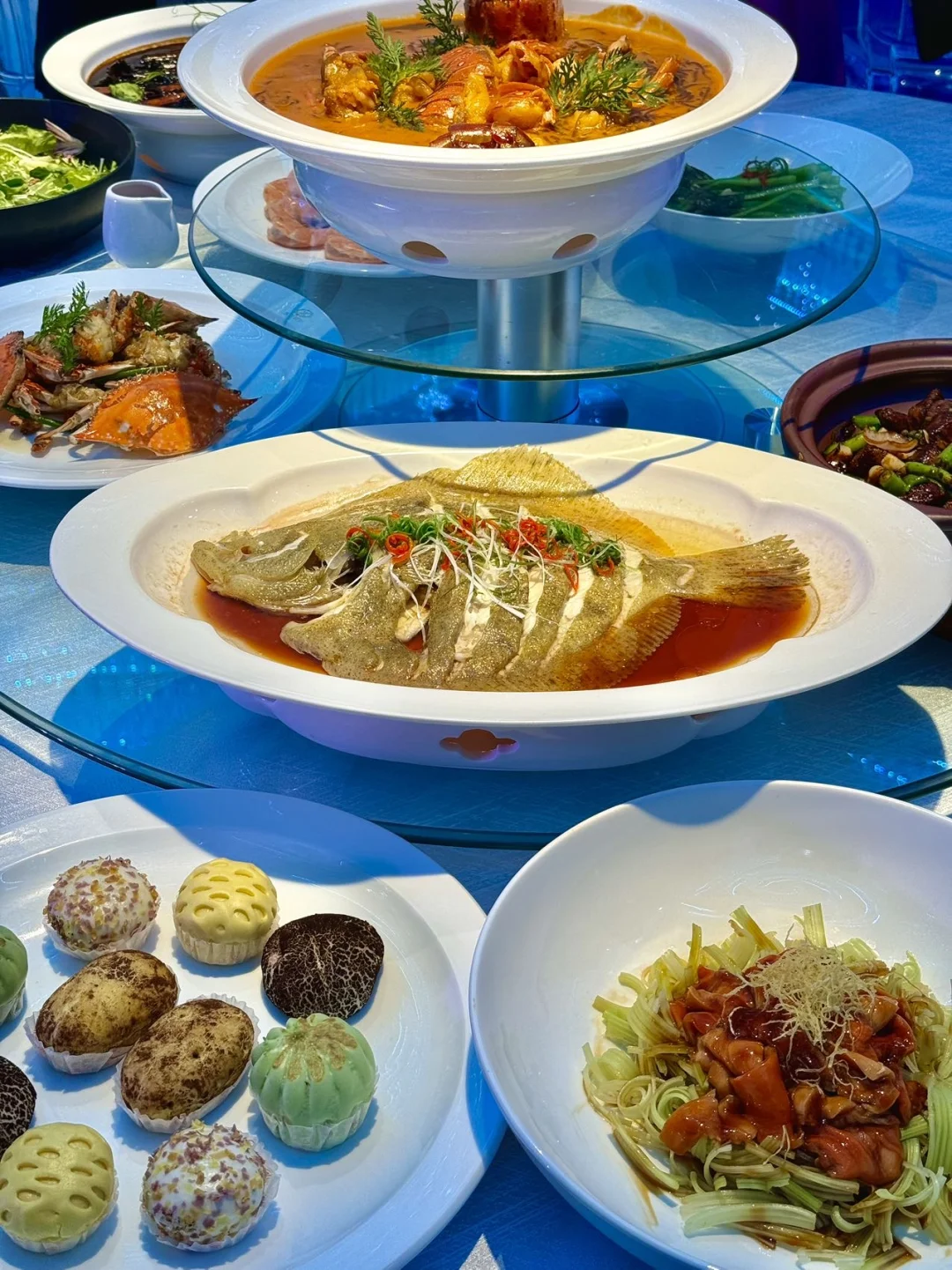菜品种类多,摆盘精致,色泽诱人,