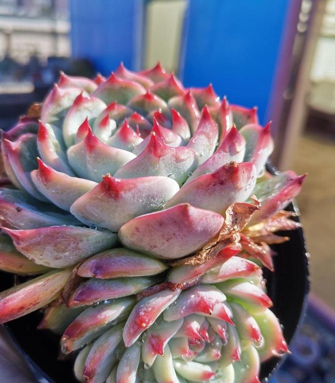 再说说不同品种多肉对比。像静夜这个品种,它的叶片比较薄,呈淡蓝色,在光照充足的情况下,叶尖会变成红色。静夜对光照的要求比吉娃娃多肉要高一些,在教室里如果光照不好,静夜很容易徒长,就是茎变得细长,叶片之间的距离拉大,整个植株看起来就很松散。而且静夜浇水不能太勤,一般10 - 15天浇一次水就可以了,比吉娃娃多肉浇水间隔要长。