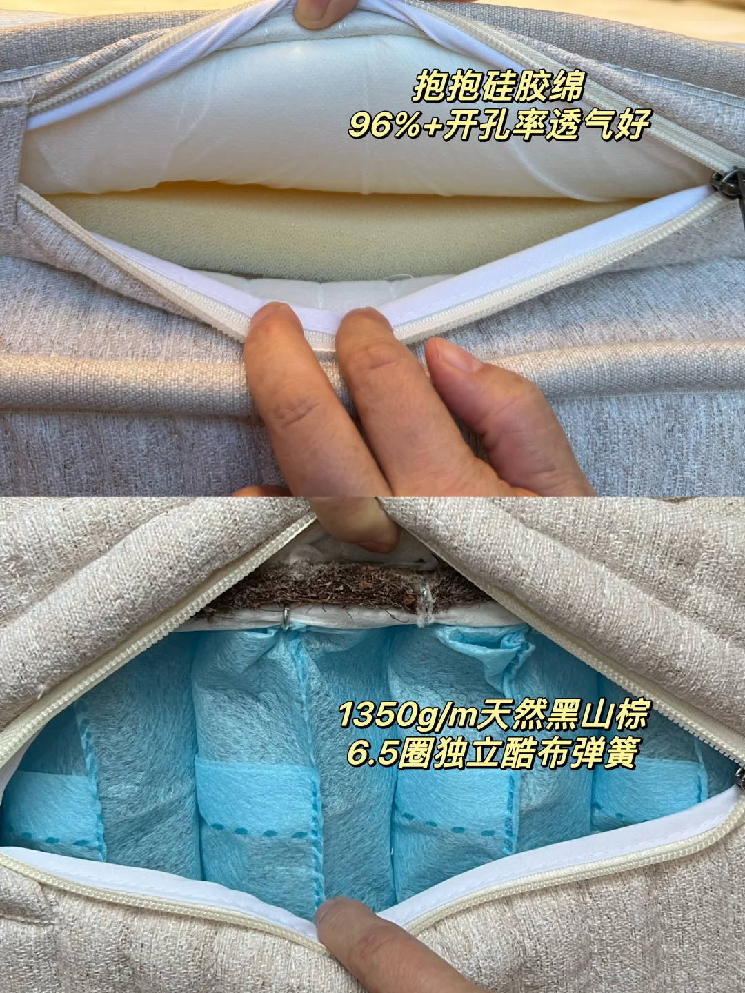 ⚠️蕞容易踩雷的是乳胶和棕榈:像乳胶长时间使用就容易粉化,所以要选含量在90%以上才更耐用;有些棕用胶水粘合难辨认,我对比后发现山棕材质更环保,一般都是手工抽丝造价高,品质更佳。姐妹们可以多做功课去鉴别📝