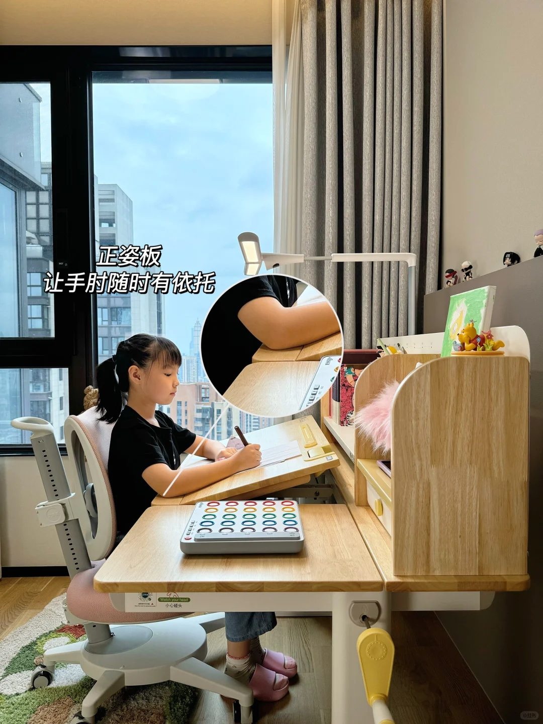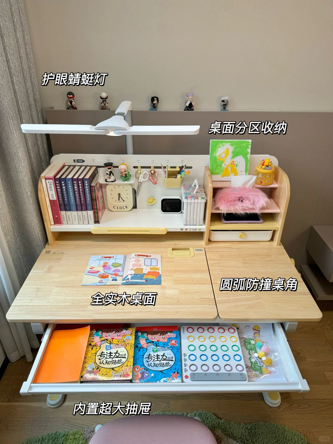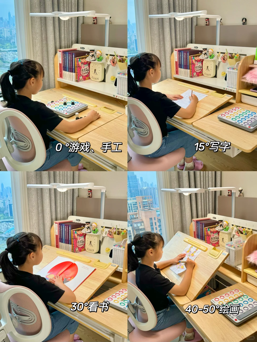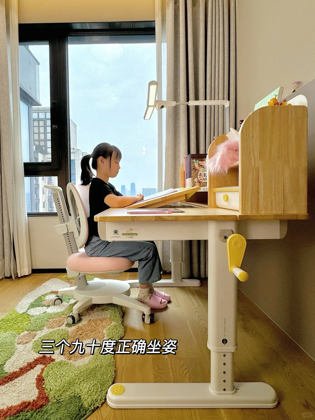 很多家长在挑选学习桌时常陷入误区,有的只看外观而忽视了实用性,有的则一味追求便宜而不顾质量与安全 新家换了五个学习桌,今天我就来分享一下网购学习桌到底应该怎么选,才不会踩坑💡 🎈一、外观和安全 学习桌的选择要把安全放在首位,避免有尖锐的边角,材质要环保。我家新换的这款 2 平米家的进取 pro 学习桌,桌角是圆弧设计,做工精细,没有毛刺,完全不用担心娃会磕碰到。👍纯实木橡胶木材质的桌面,收到就没有异味,超安心。粉色➕原木色的配色小女生很喜欢💕 🎈二、实用和成长性 学习桌要能手摇调节高度,不插电好移动,娃可以从小用到大。桌面板要能调节角度,以便端正坐姿。✨2平米进取 pro 学习桌桌面很大,有 70cm 的深度,学习、手工都够用。桌板0~50°随意调节,能满足娃不同的使用场景。切换面板角度也很方便,一按一拉就好了。桌板前还有正姿板,读书、写字、画画等手肘都有支撑,能与书本保持一拳的距离,更好地端正孩子的坐姿💪 🎈三、功能性 收纳空间很重要。2平米进取 pro 学习桌的收纳非常强大。自带收纳分区,还有一个超大的抽屉。书本、画笔、盲盒工具都能放在孩子方便拿取的位置。避免脏乱,让娃从小养成自主收纳的好习惯👏 🎈四、学习椅搭配 学习椅要选择能调节高度的。我家搭配的博睿学习椅,不仅能调节座椅高度,腰托、椅背、座垫高度都能调节。腰托能够牢牢支撑孩子的腰背部,侧面看就是标准的 3 个 90°,坐姿正确了不容易近视驼背 🎈五、护眼灯选择 摆放学习桌的位置要有充足的光线。我搭配的蜻蜓护眼灯,它的光照范围很广,灯头 180 度角度和前后都可调节,一打开整个桌面都照亮了。全光谱光源,灯光柔和不刺眼,无频闪和蓝光危害,能更好地保护娃的眼睛。夹在学习桌上,不会霸占桌面空间💡 如果看完还是不会选的,也可以直接抄作业💖
