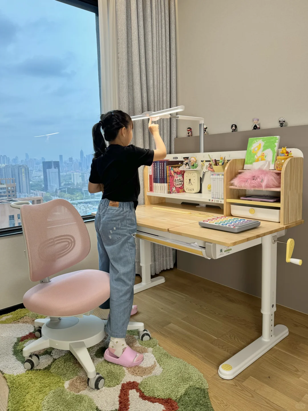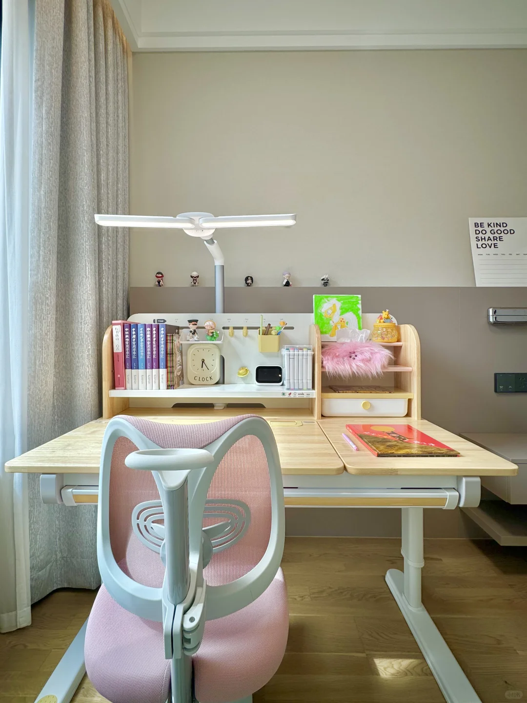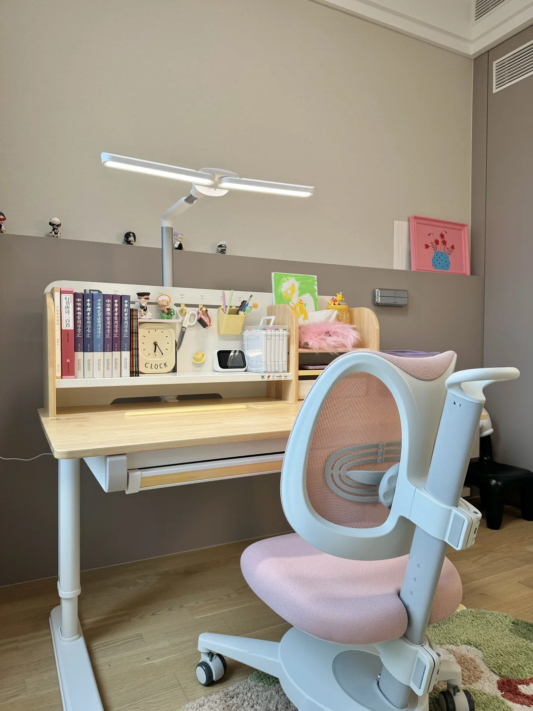 很多家长在挑选学习桌时常陷入误区,有的只看外观而忽视了实用性,有的则一味追求便宜而不顾质量与安全 新家换了五个学习桌,今天我就来分享一下网购学习桌到底应该怎么选,才不会踩坑💡 🎈一、外观和安全 学习桌的选择要把安全放在首位,避免有尖锐的边角,材质要环保。我家新换的这款 2 平米家的进取 pro 学习桌,桌角是圆弧设计,做工精细,没有毛刺,完全不用担心娃会磕碰到。👍纯实木橡胶木材质的桌面,收到就没有异味,超安心。粉色➕原木色的配色小女生很喜欢💕 🎈二、实用和成长性 学习桌要能手摇调节高度,不插电好移动,娃可以从小用到大。桌面板要能调节角度,以便端正坐姿。✨2平米进取 pro 学习桌桌面很大,有 70cm 的深度,学习、手工都够用。桌板0~50°随意调节,能满足娃不同的使用场景。切换面板角度也很方便,一按一拉就好了。桌板前还有正姿板,读书、写字、画画等手肘都有支撑,能与书本保持一拳的距离,更好地端正孩子的坐姿💪 🎈三、功能性 收纳空间很重要。2平米进取 pro 学习桌的收纳非常强大。自带收纳分区,还有一个超大的抽屉。书本、画笔、盲盒工具都能放在孩子方便拿取的位置。避免脏乱,让娃从小养成自主收纳的好习惯👏 🎈四、学习椅搭配 学习椅要选择能调节高度的。我家搭配的博睿学习椅,不仅能调节座椅高度,腰托、椅背、座垫高度都能调节。腰托能够牢牢支撑孩子的腰背部,侧面看就是标准的 3 个 90°,坐姿正确了不容易近视驼背 🎈五、护眼灯选择 摆放学习桌的位置要有充足的光线。我搭配的蜻蜓护眼灯,它的光照范围很广,灯头 180 度角度和前后都可调节,一打开整个桌面都照亮了。全光谱光源,灯光柔和不刺眼,无频闪和蓝光危害,能更好地保护娃的眼睛。夹在学习桌上,不会霸占桌面空间💡 如果看完还是不会选的,也可以直接抄作业💖