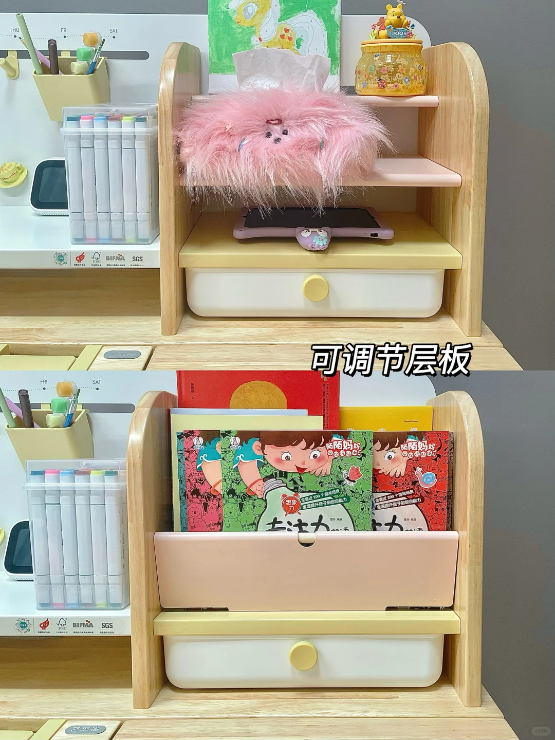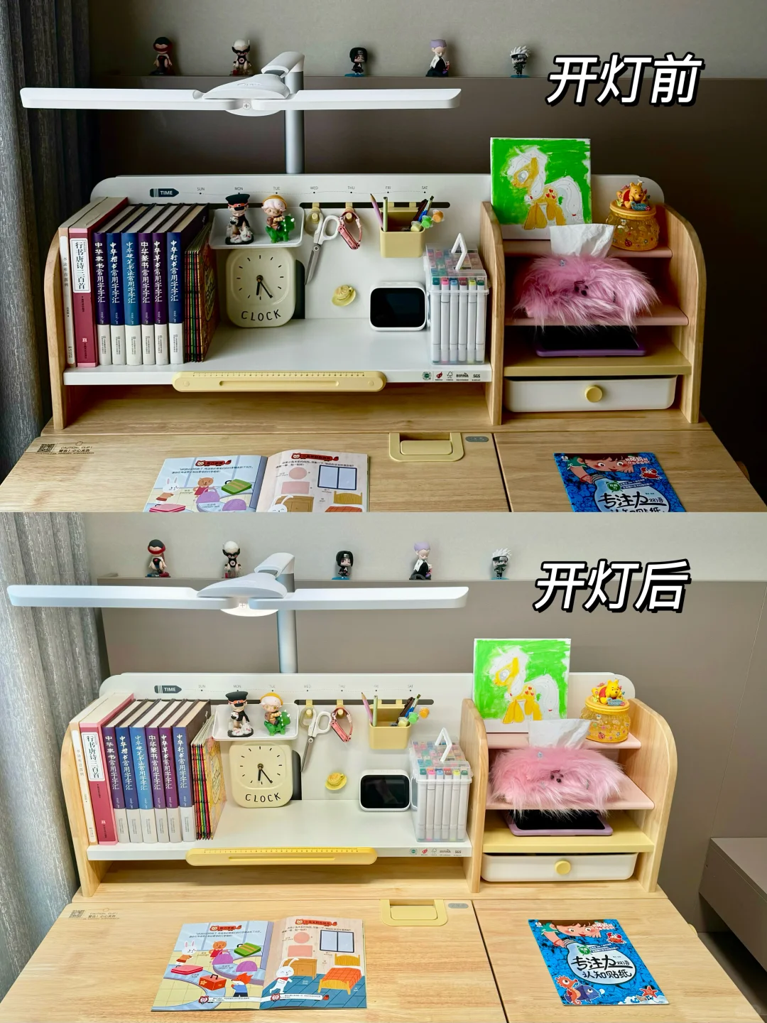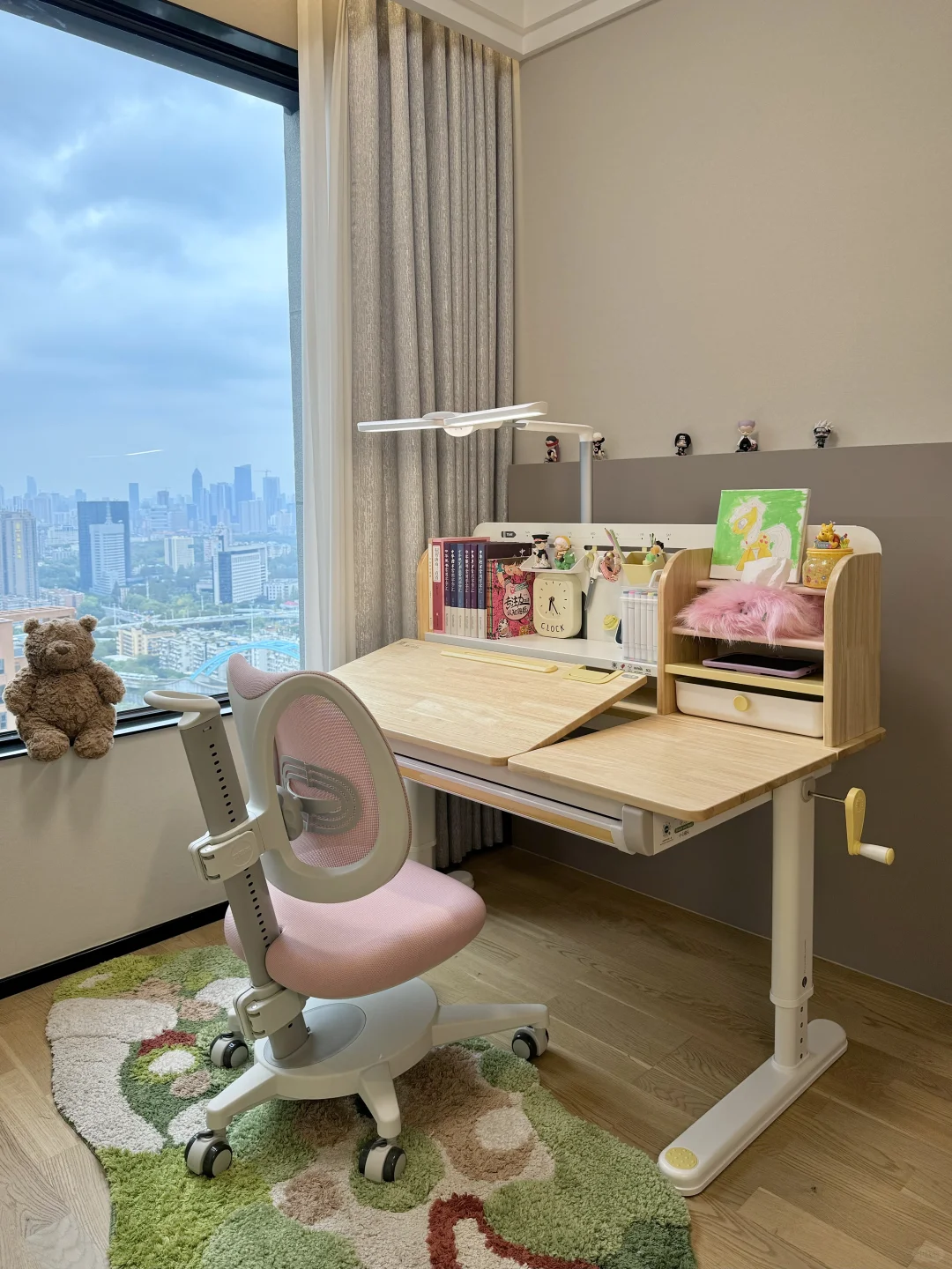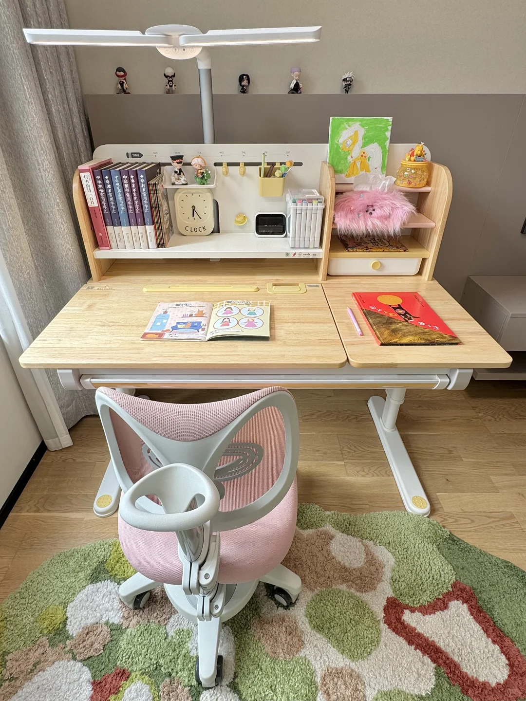 很多家长在挑选学习桌时常陷入误区,有的只看外观而忽视了实用性,有的则一味追求便宜而不顾质量与安全 新家换了五个学习桌,今天我就来分享一下网购学习桌到底应该怎么选,才不会踩坑💡 🎈一、外观和安全 学习桌的选择要把安全放在首位,避免有尖锐的边角,材质要环保。我家新换的这款 2 平米家的进取 pro 学习桌,桌角是圆弧设计,做工精细,没有毛刺,完全不用担心娃会磕碰到。👍纯实木橡胶木材质的桌面,收到就没有异味,超安心。粉色➕原木色的配色小女生很喜欢💕 🎈二、实用和成长性 学习桌要能手摇调节高度,不插电好移动,娃可以从小用到大。桌面板要能调节角度,以便端正坐姿。✨2平米进取 pro 学习桌桌面很大,有 70cm 的深度,学习、手工都够用。桌板0~50°随意调节,能满足娃不同的使用场景。切换面板角度也很方便,一按一拉就好了。桌板前还有正姿板,读书、写字、画画等手肘都有支撑,能与书本保持一拳的距离,更好地端正孩子的坐姿💪 🎈三、功能性 收纳空间很重要。2平米进取 pro 学习桌的收纳非常强大。自带收纳分区,还有一个超大的抽屉。书本、画笔、盲盒工具都能放在孩子方便拿取的位置。避免脏乱,让娃从小养成自主收纳的好习惯👏 🎈四、学习椅搭配 学习椅要选择能调节高度的。我家搭配的博睿学习椅,不仅能调节座椅高度,腰托、椅背、座垫高度都能调节。腰托能够牢牢支撑孩子的腰背部,侧面看就是标准的 3 个 90°,坐姿正确了不容易近视驼背 🎈五、护眼灯选择 摆放学习桌的位置要有充足的光线。我搭配的蜻蜓护眼灯,它的光照范围很广,灯头 180 度角度和前后都可调节,一打开整个桌面都照亮了。全光谱光源,灯光柔和不刺眼,无频闪和蓝光危害,能更好地保护娃的眼睛。夹在学习桌上,不会霸占桌面空间💡 如果看完还是不会选的,也可以直接抄作业💖