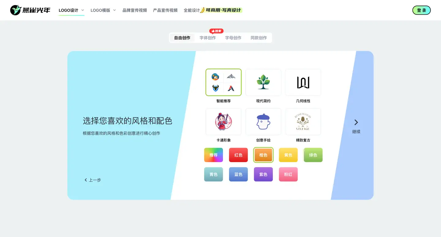 定制你的品味 AI 会询问你喜欢的风格偏好。是想要“现代简约”还是“卡通形象”?为了获取更广泛的灵感,图中我们选择了 “智能推荐”,并指定了能勾起食欲的温暖 “橙色”。 并且在创意方案中输入你想要的,通过这段精准的描述,AI 就能准确理解你想要的意境,生成的 Logo 才会更有“人情味”。