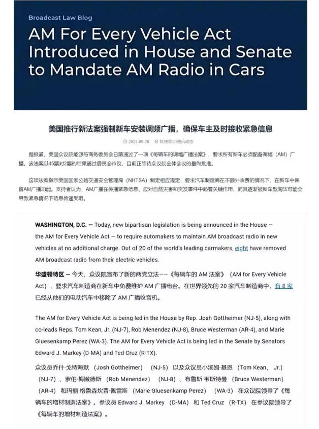 值得关注的是,中美两国均出台政策,强制要求车载收音机配备。工信部在车载无线广播接收系统征求意见中指出,近年新车尤其是新能源车纷纷取消车载收音机,但在台风、地震、基站受损的情况下,收音机是接收外界信息的重要应急设备,有必要强制上车。巧的是,几乎同一时间,美国众议院同期通过《2024车载调幅广播法案》,要求车辆必须支持AM广播信号接收,且不得额外收费。两国政策层面的重视,印证了车载收音机的应急核心价值。