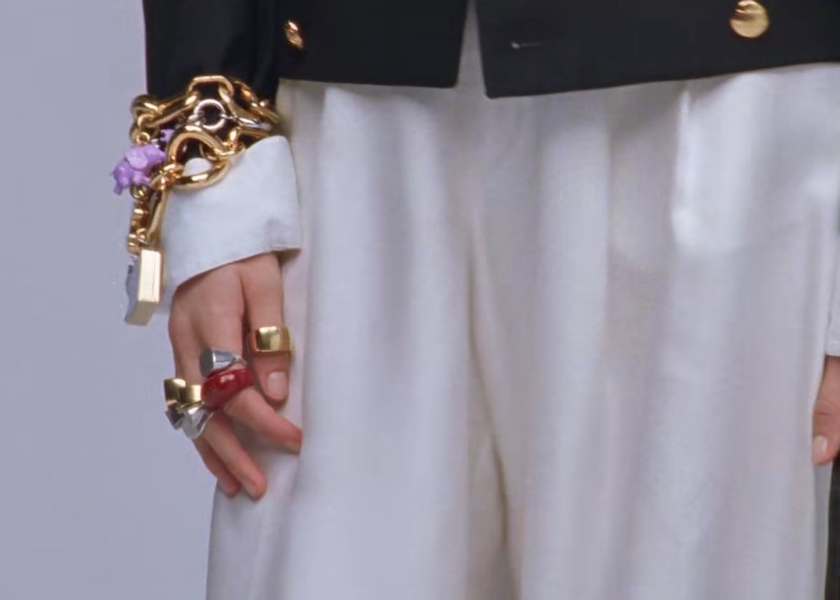 本季形象中,很多造型都采用了 金属混搭:金色 Charm 与银色 Charm 出现在同一根粗链或手链上,看似随意,实际非常 CELINE。如果日常衣橱以黑、白、灰为主,可以选择 一金一银 的组合,既增加层次,又不会抢走整体风格的控制权;想更张扬一些,可以在同一处集中佩戴 4–5 枚大小不一的 Charms,让它成为整套造型唯一的“噪点”。