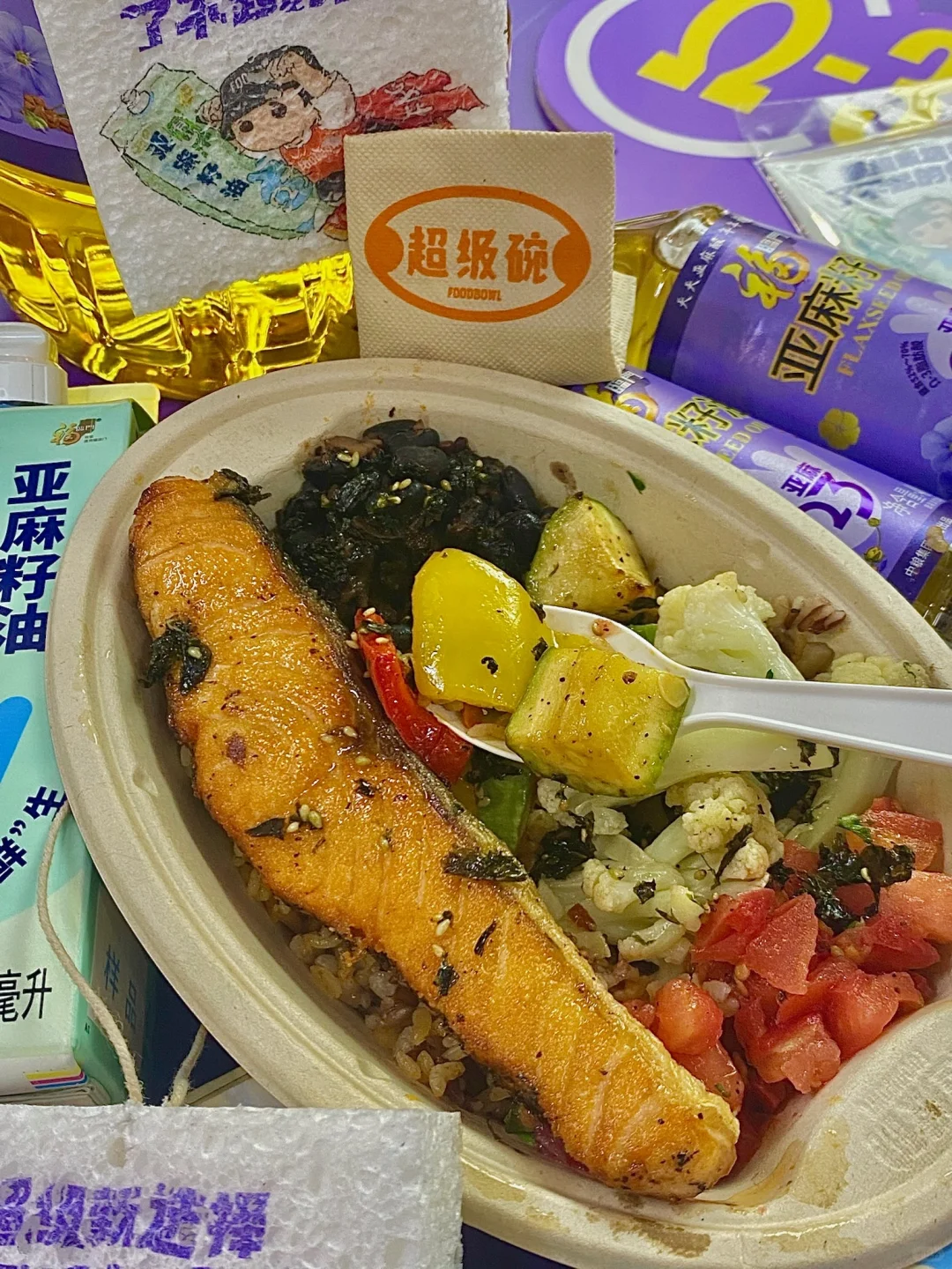 我选了一份三文鱼超级碗,配菜丰富,而且用亚麻籽油煎出来的三文鱼还格外的香!味道上也是遥遥领先…