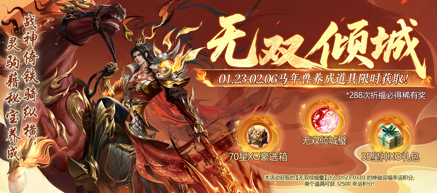 和吕布祈福同步开启的无双倾城活动(1月23日-2月6日),是马年兽养成的关键补给站,50级玩家可用无双缘晶和倾城约契参与。抽奖有概率获得无双倾城璧,这是年兽养成的核心道具,还能开出70星XO豪选箱、35星XO礼包等材料。
