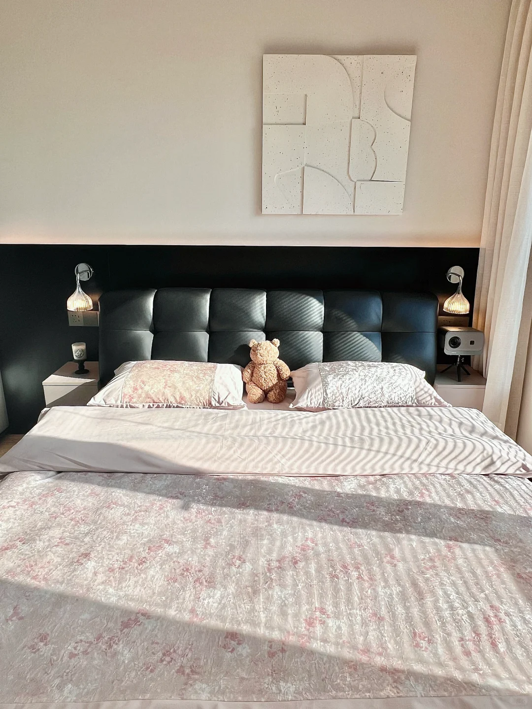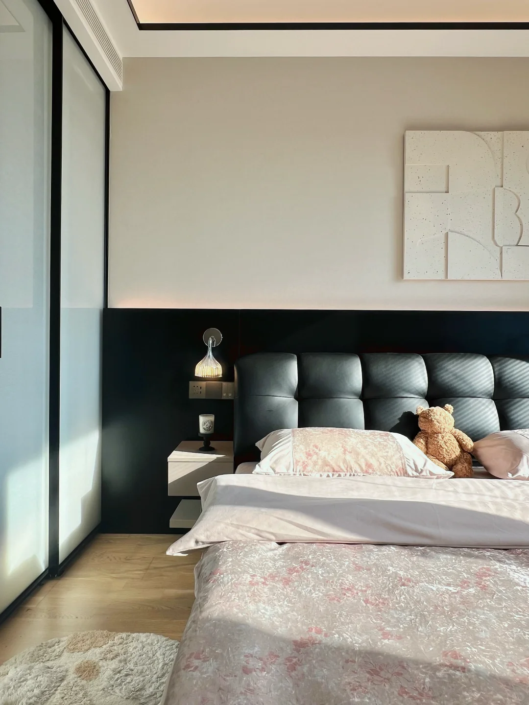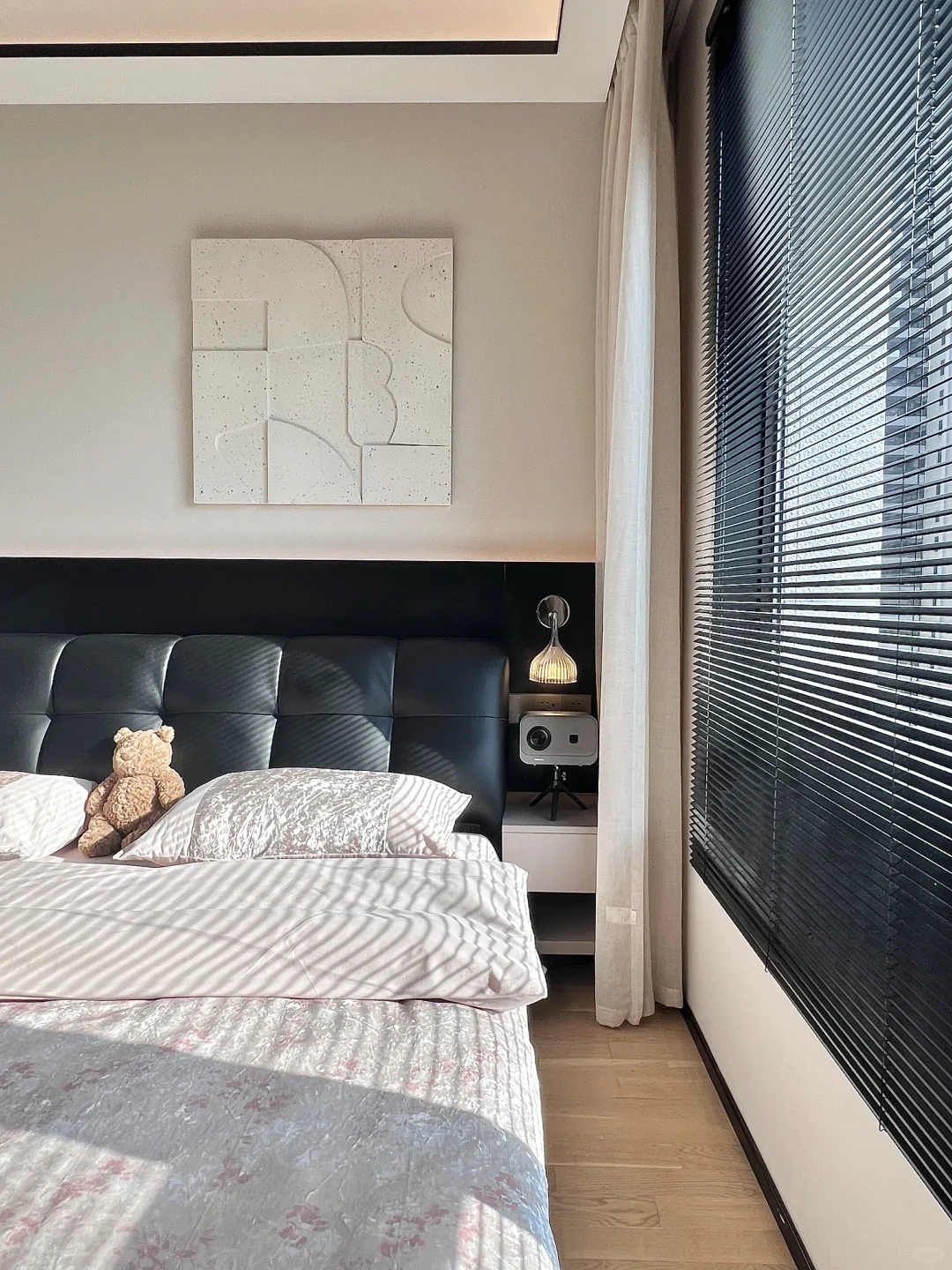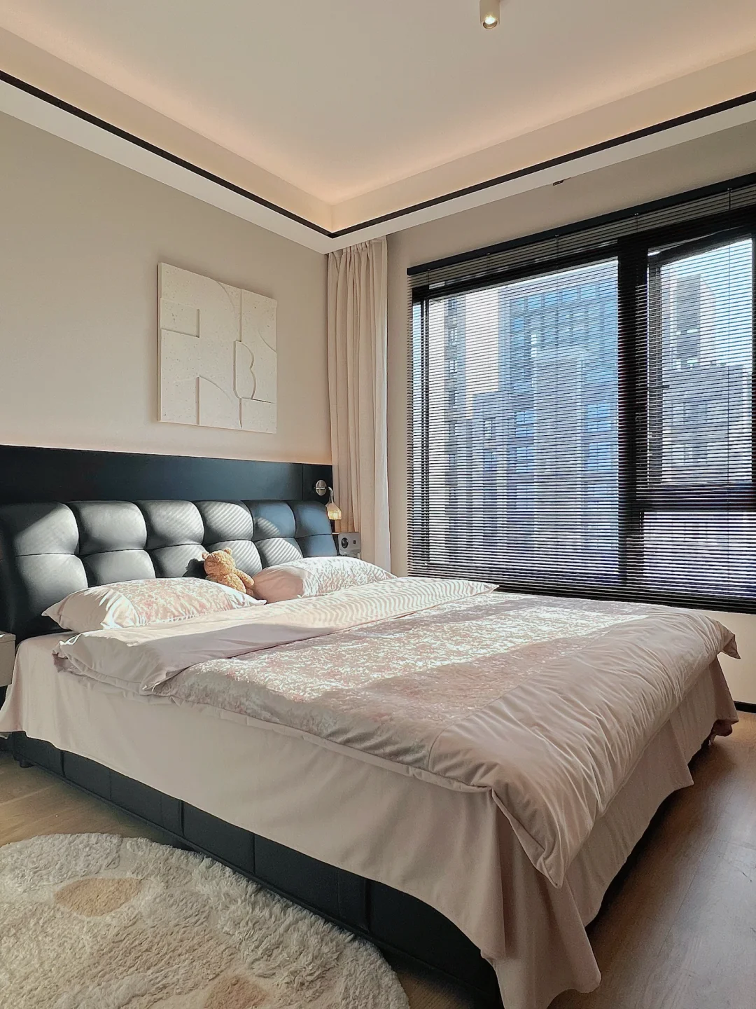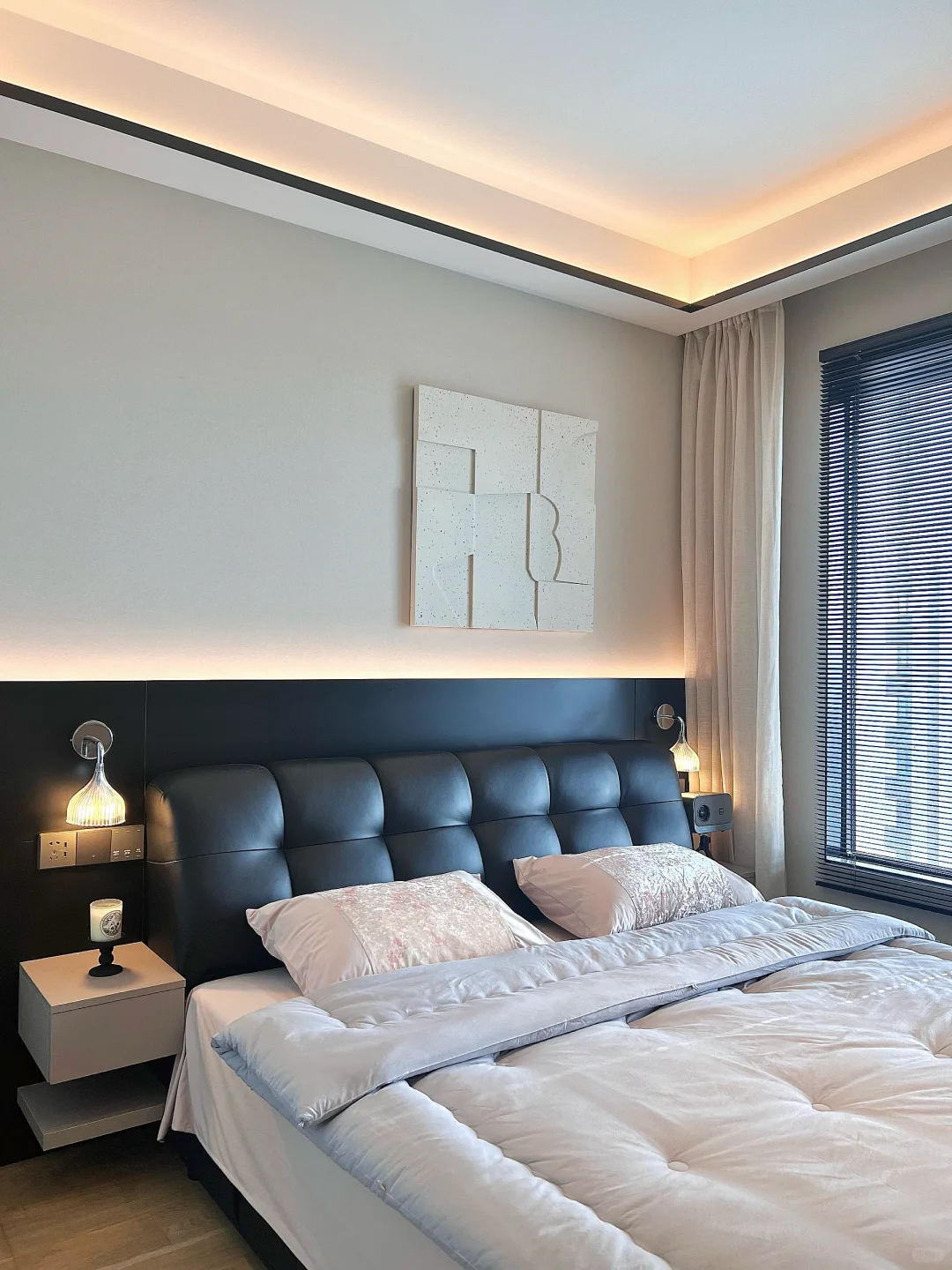 工作了一整天回到家,洗完澡换了入秋的被子和四件套,躺在我的小床上,太舒服啦! ~ 原本我这个卧室又小又丑 我砸掉了没用的飘窗 做了床头板床换成了储物的,床尾做悬浮桌 左边做了玻璃U形四面衣帽间房间更通透 墙面通刷艺术漆,没有吊顶只做了灯槽包黑色极窄不锈钢 窗帘是麻纱搭配黑百叶。 我家卧室很简单但真的很好睡☁