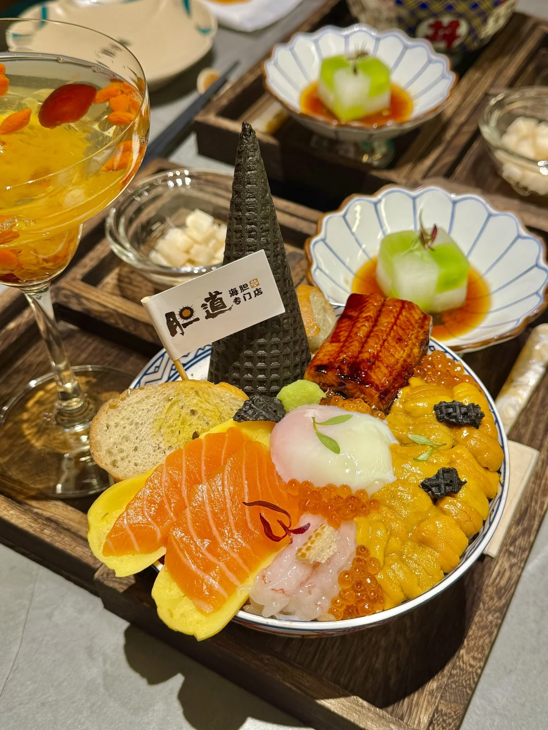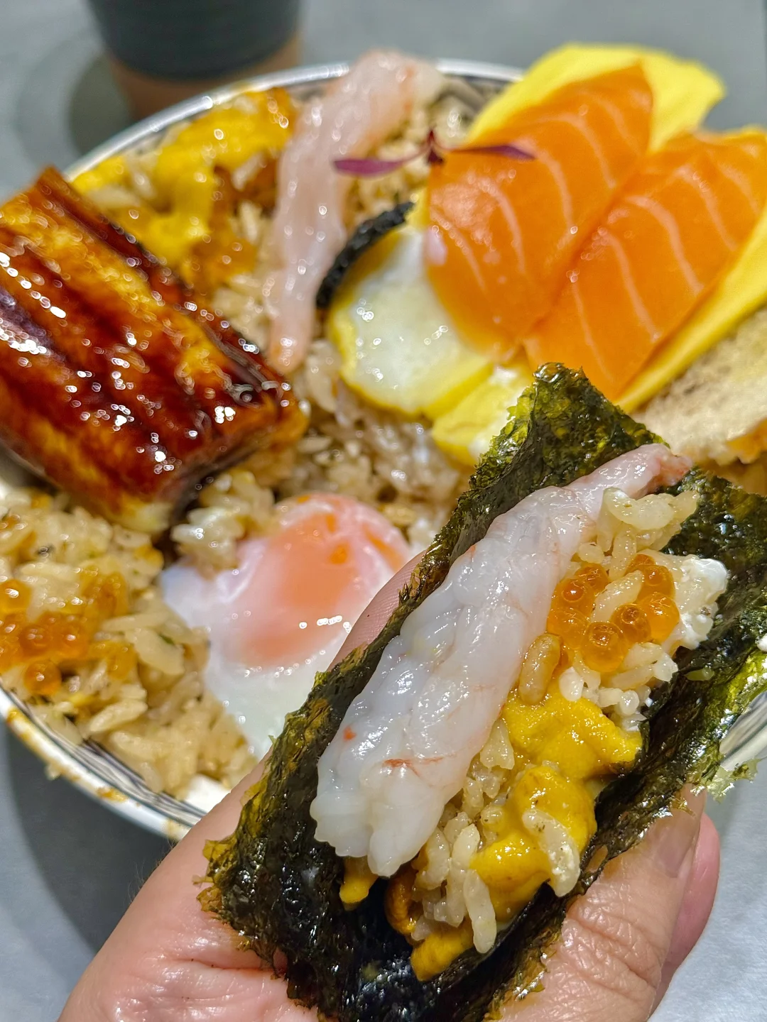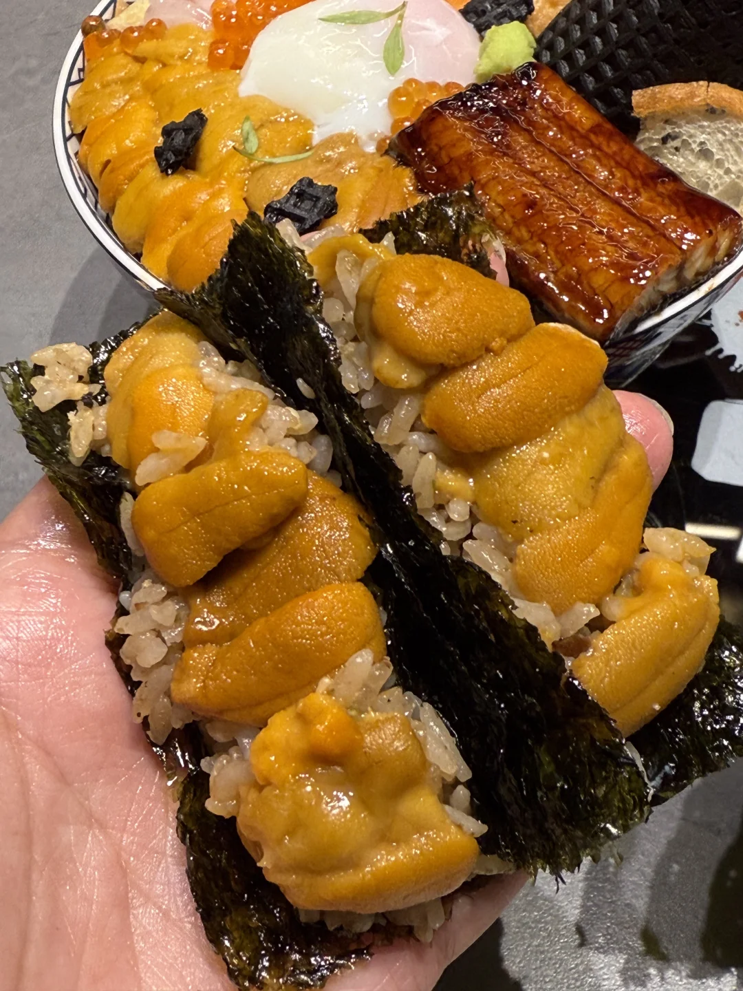 ZUI近姐妹带我来吃了一份无敌丰盛的海胆饭! 足足用了四只海胆,而且还加了三文鱼、甜虾、烤鳗鱼、鱼子酱…真是奢华版的享受啊! 海胆都是现开的,色泽鲜艳,入口真是鲜美鲜甜JI了!尝了海胆和刺身,再用温泉蛋伴着米饭一起,味道好浓郁! 也可以自己组合DIY的吃法,这一碗199r的海胆饭套餐,真是让我吃出了超越价格的体验的味道!值了!