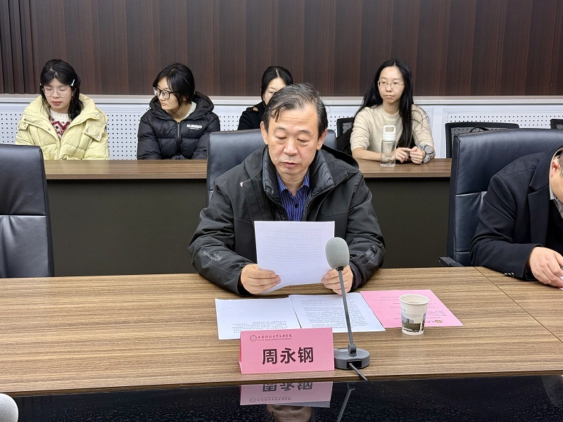随后,我校产业学院副院长周永钢发表欢迎辞。周院长对马先标高级研究员的到来表示热烈欢迎,高度肯定了其在相关学术领域取得的卓越成就,并指出,聘任马先标高级研究员为讲座教授,是学院落实“人才强校”战略、加强师资队伍建设、推动学科高质量发展的重要举措。希望通过此次合作,借助马教授的专业优势,进一步提升学院经济管理类学科的教学科研水平,拓宽师生的学术视野,为学院人才培养、学术合作注入新的活力,助力学院培养更多适应时代发展需求的高素质应用型人才。