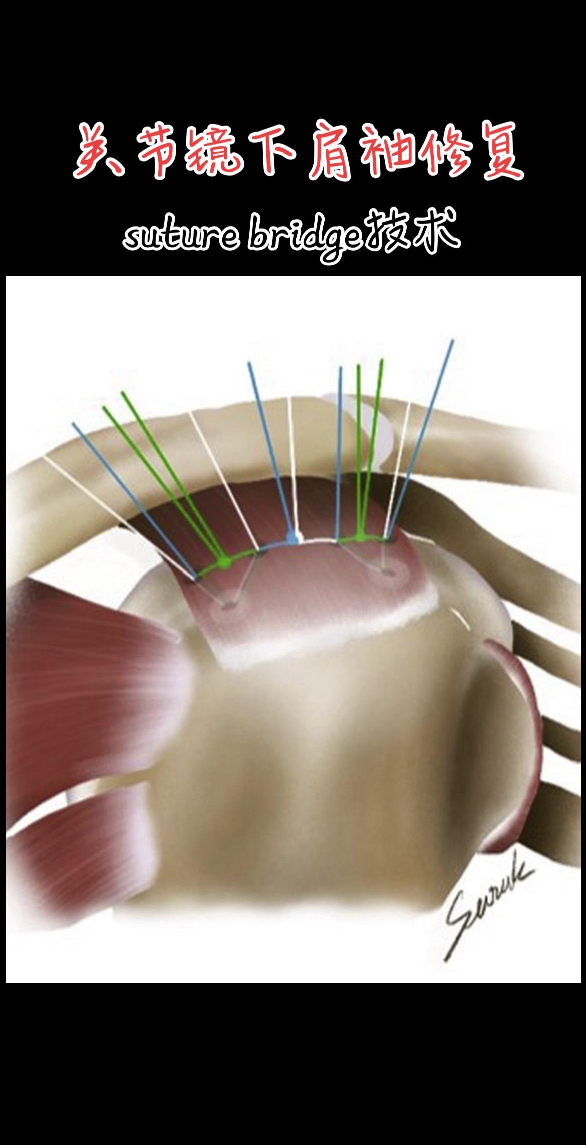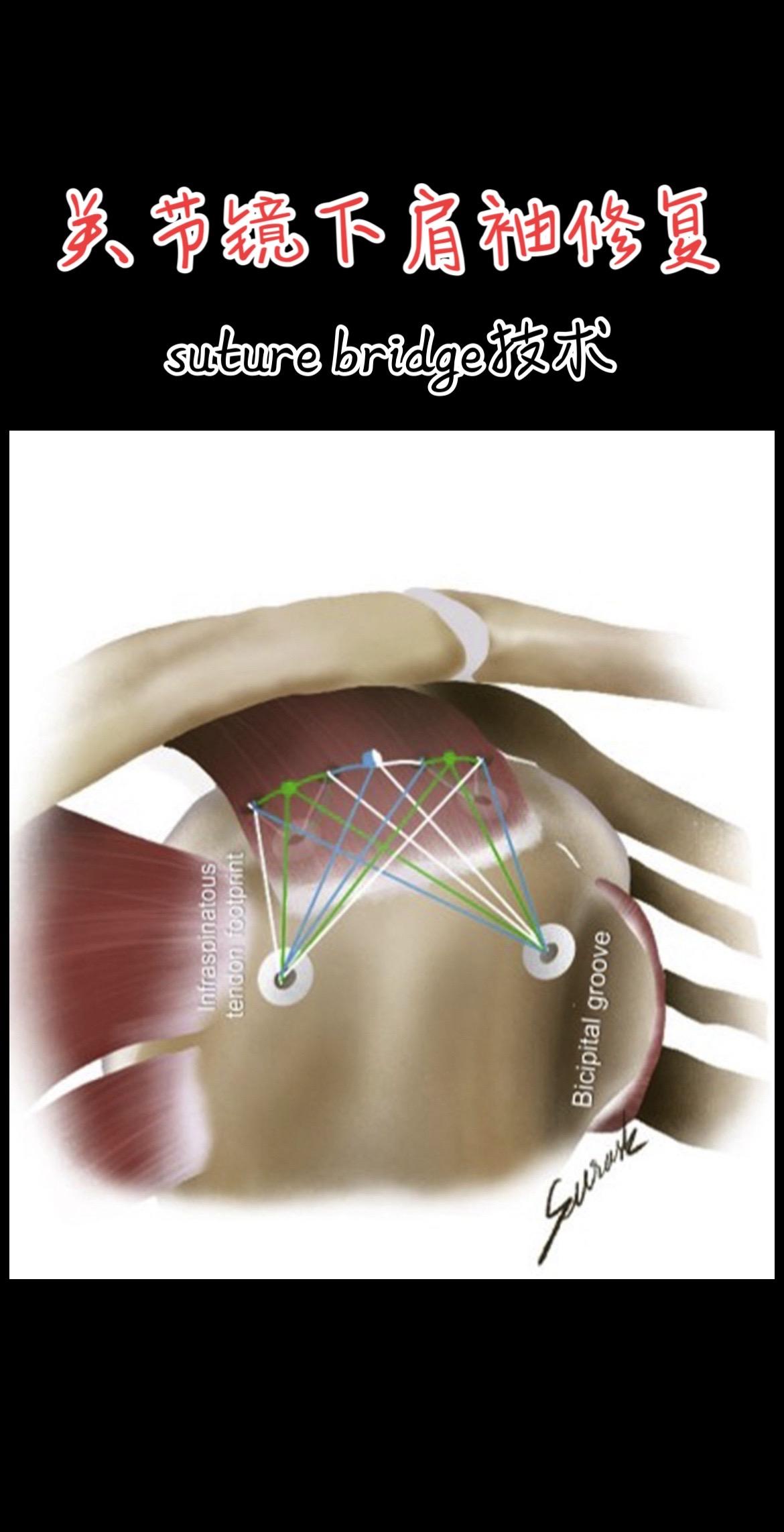 关节镜下肩袖修复术。缝线桥(suture bridge技术)布线。Ar...