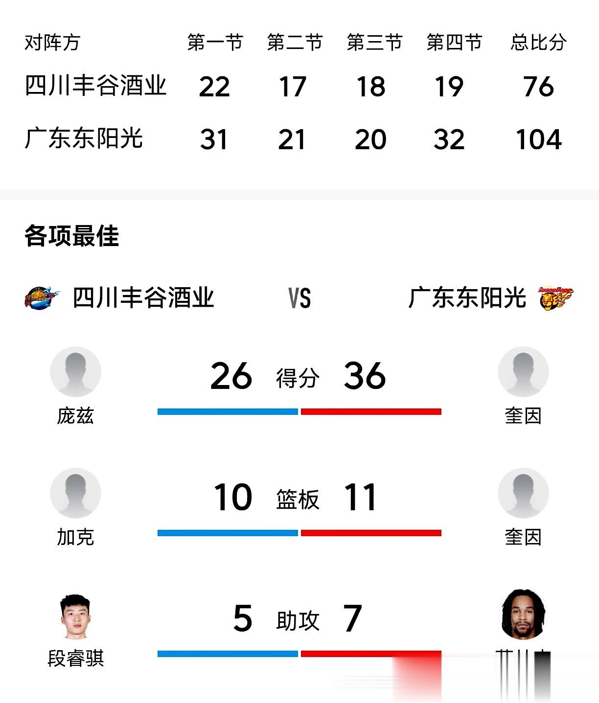 2,四川丰谷酒业76-104大比分负于广东东阳光。