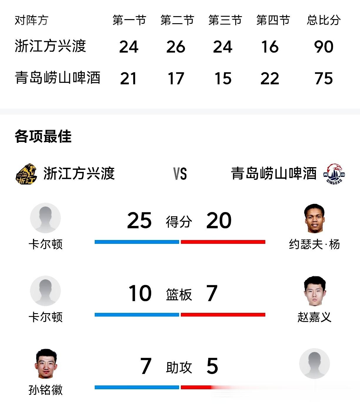 三,比赛综述:第一节:开局,浙江方兴渡冲击内线,7-2领先,12-7领先。青岛队外线三分命中,布朗两记三分,孙铭徽打篮下得分,22-10。随后青岛队连续进攻得分。第一节战罢,浙江方兴渡以24-21领先3分结束。首节孙铭徽和卡尔顿各得7分,布朗6分。