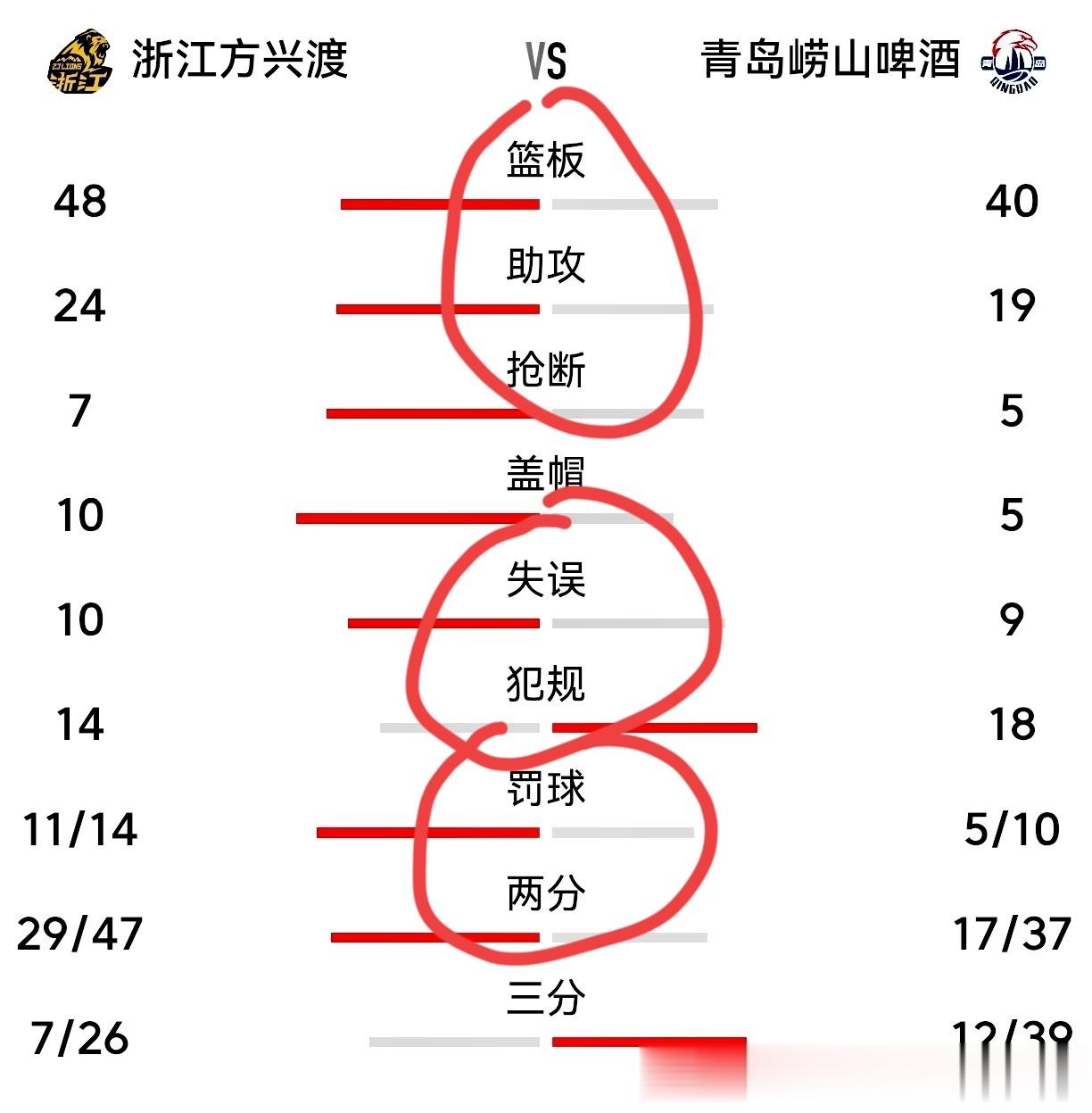 2,浙江方兴渡在篮板球、助攻、抢断、盖帽、两分球和罚球命中率及攻防能力上占优势。全队全场稳定发挥,掌控了场上的主动权和节奏。