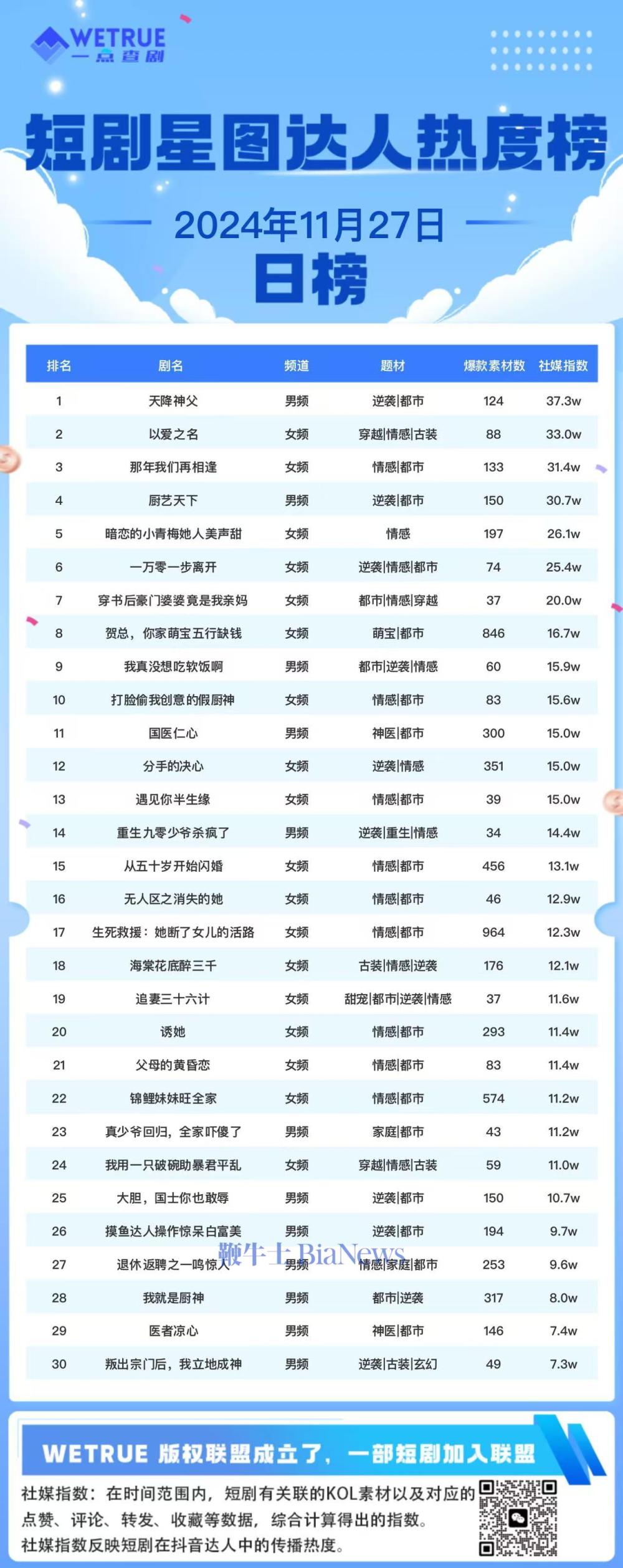 11月28日消息,为帮助短剧从业者提供更多信息,专注于短剧报道的新腕儿和科技媒体鞭牛士联合WETRUE短剧热度榜共同推出多种短剧热度榜。