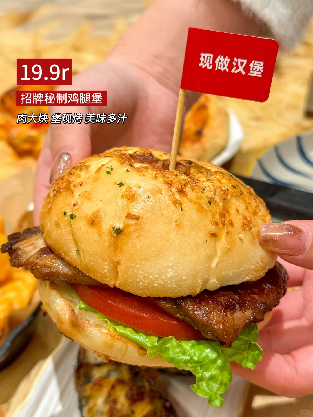 🍔招牌秘制鸡腿堡只要💰19.9元!太适合一人食了!!👍🍗鸡腿堡当日现烤,外表酥脆内里软嫩!一大块油润多汁的鸡腿肉🥬搭配新鲜蔬菜和多汁番茄,一口就满足!!