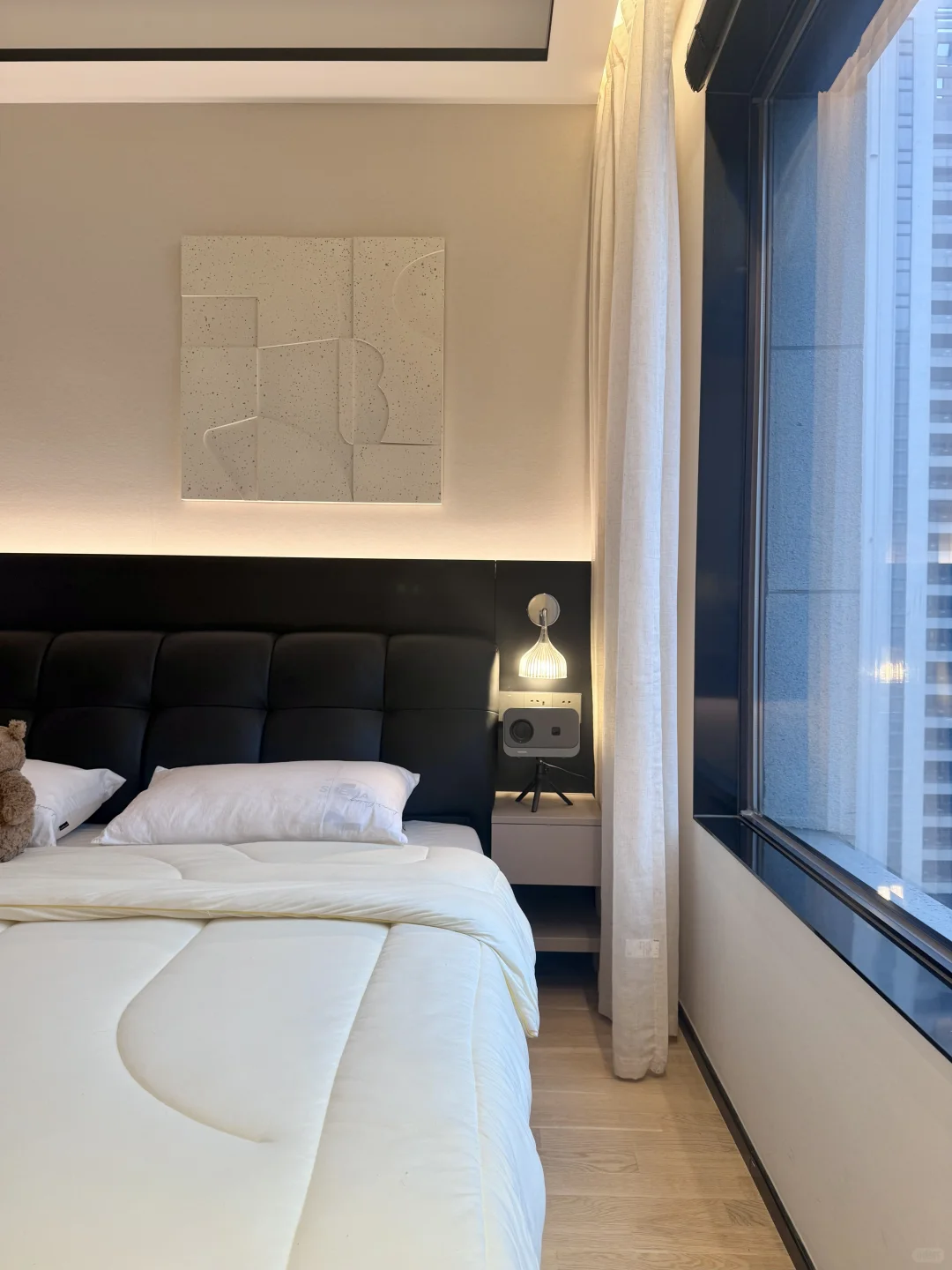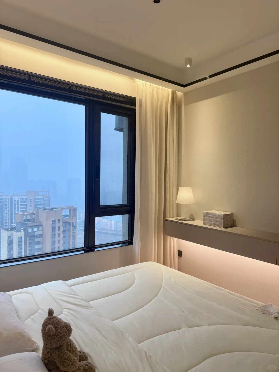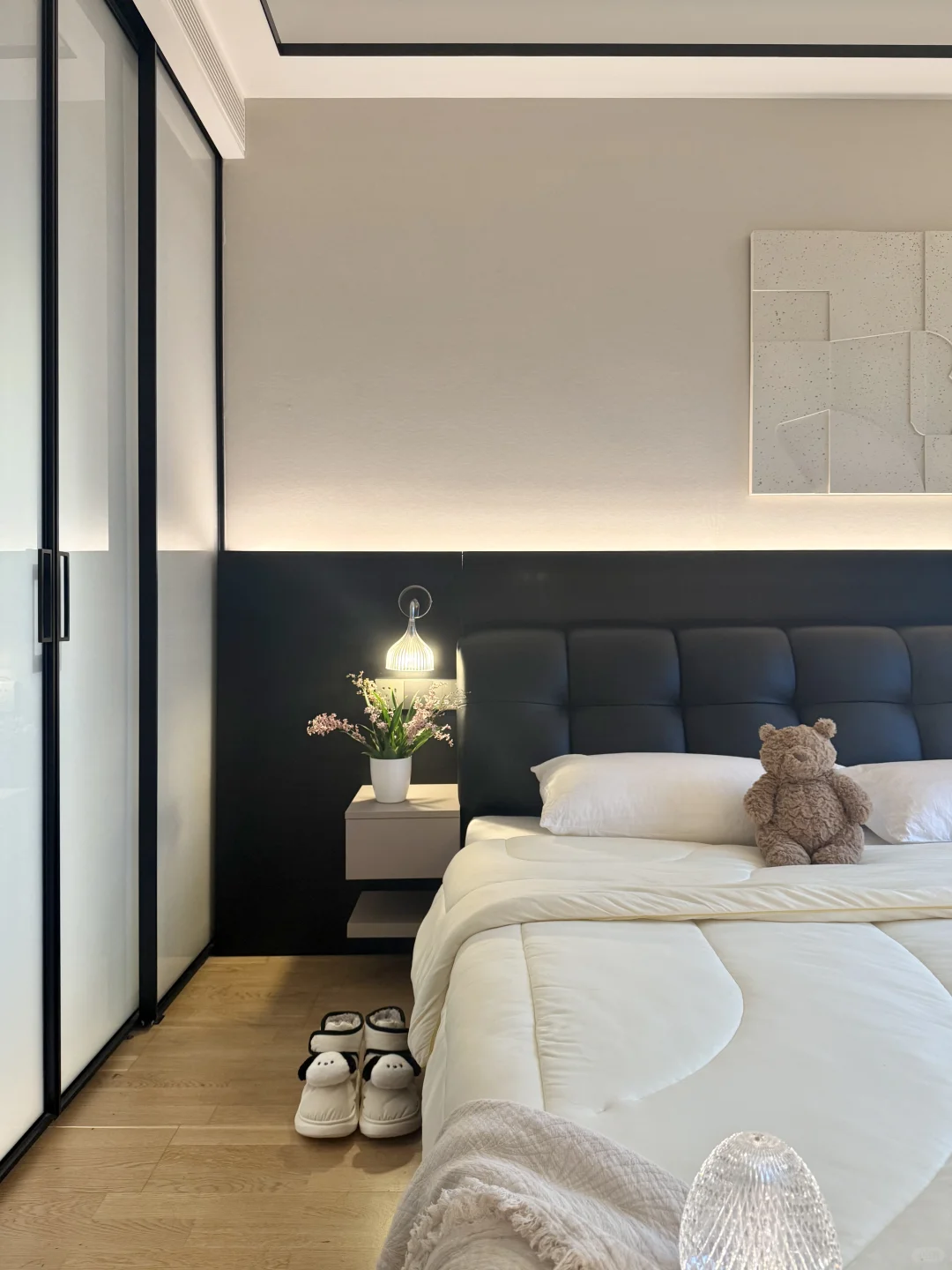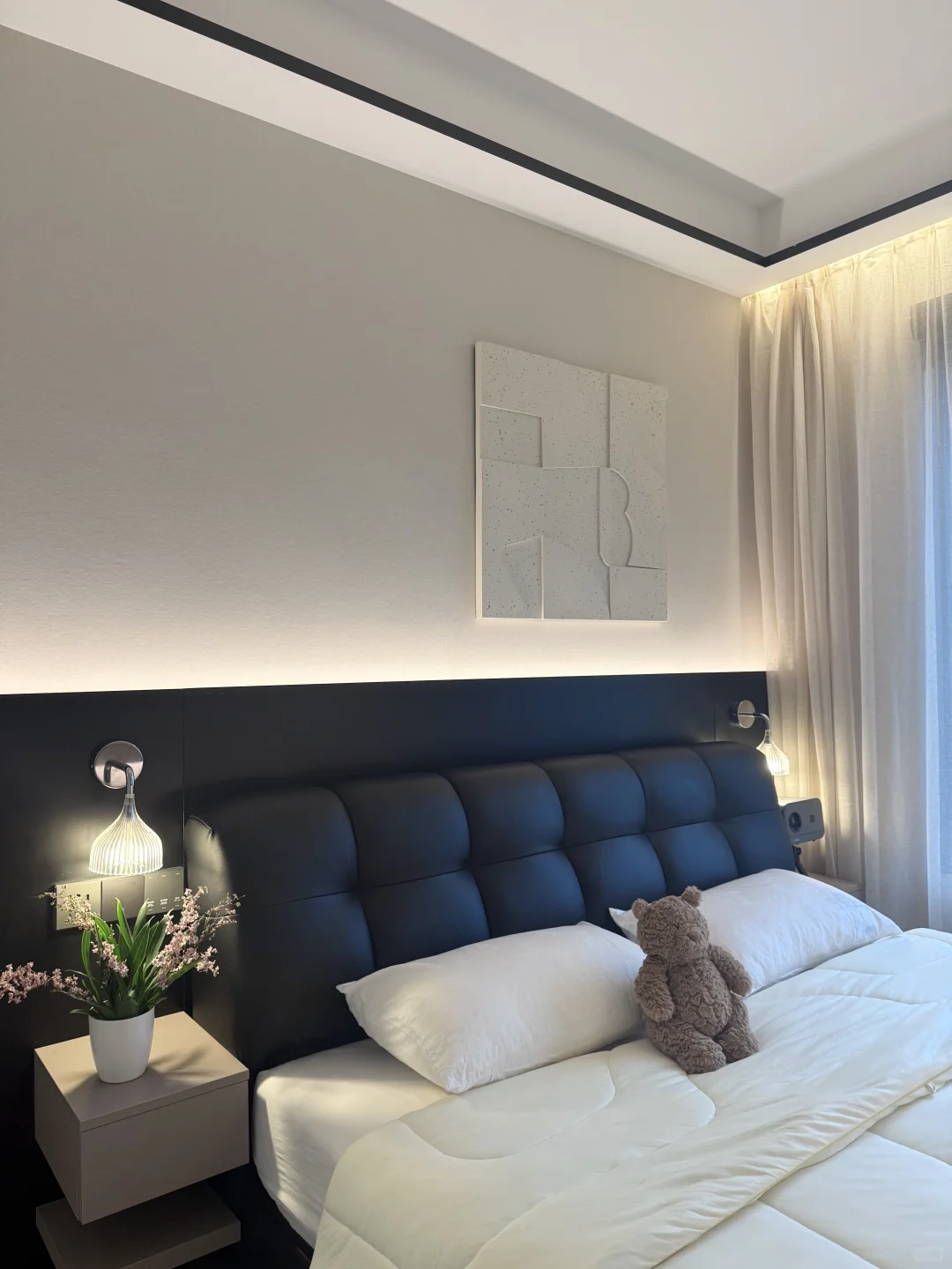 我这个卧室很小 我砸掉了没用的飘窗 做了床头护墙板床换成了储物的,床尾做悬浮桌 做了玻璃U形四面衣帽间 墙面通刷艺术漆 吊顶只做了灯槽包黑色极窄不锈钢 窗帘是麻纱搭配黑百叶。 我的卧室很简单,但真的很舒服~