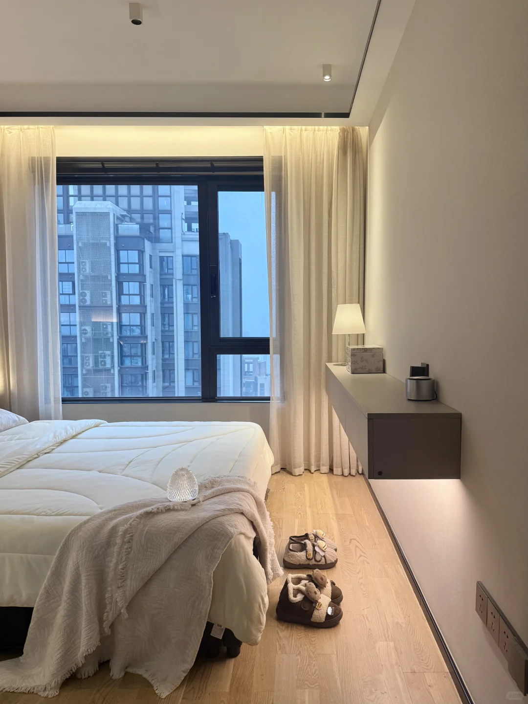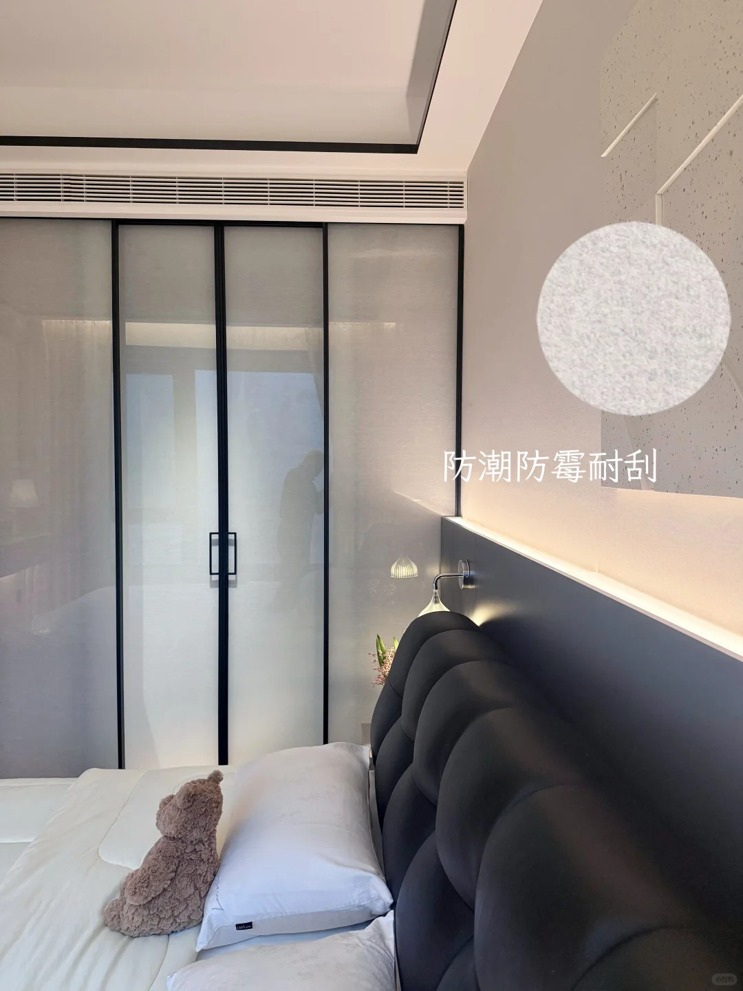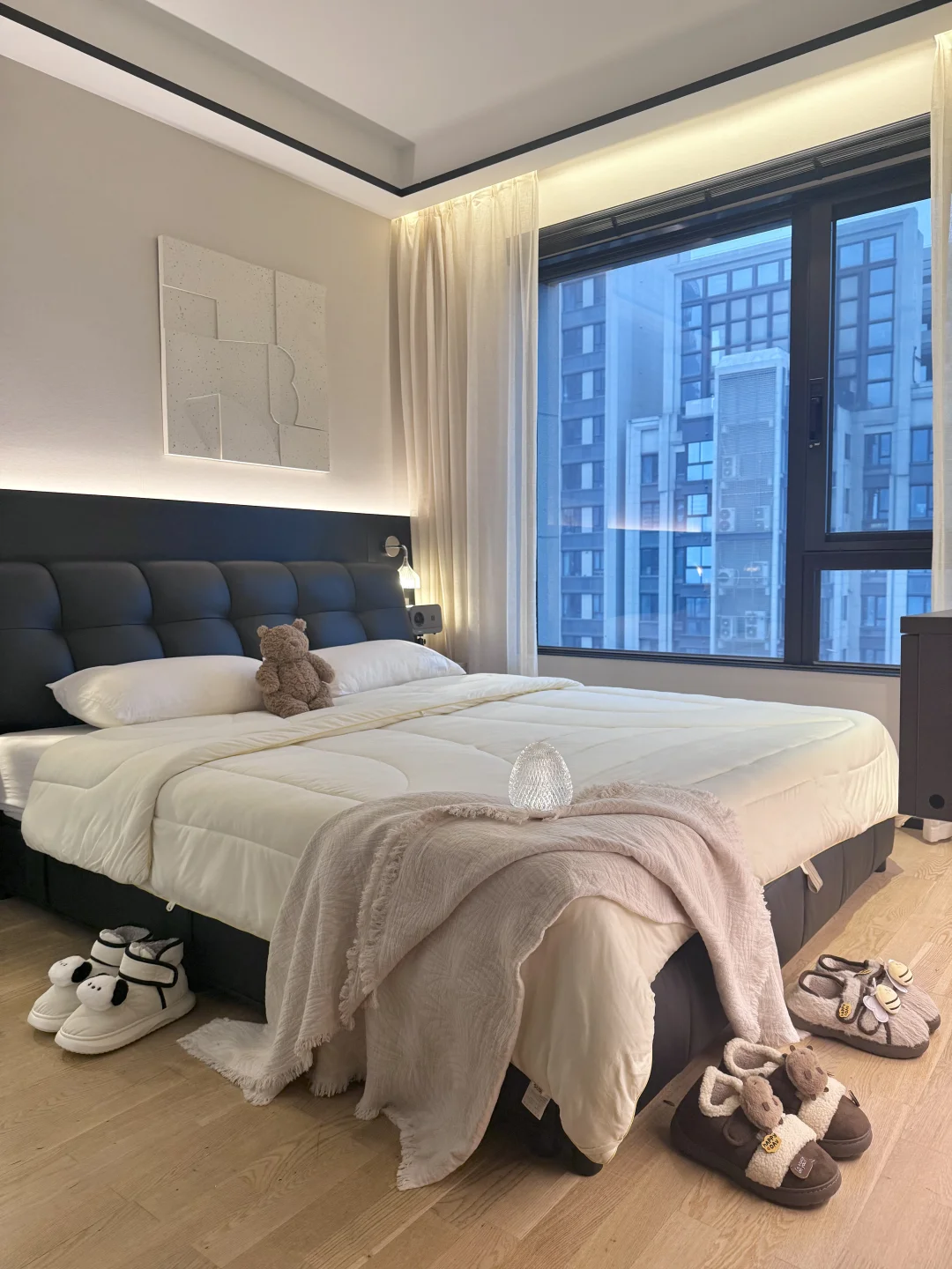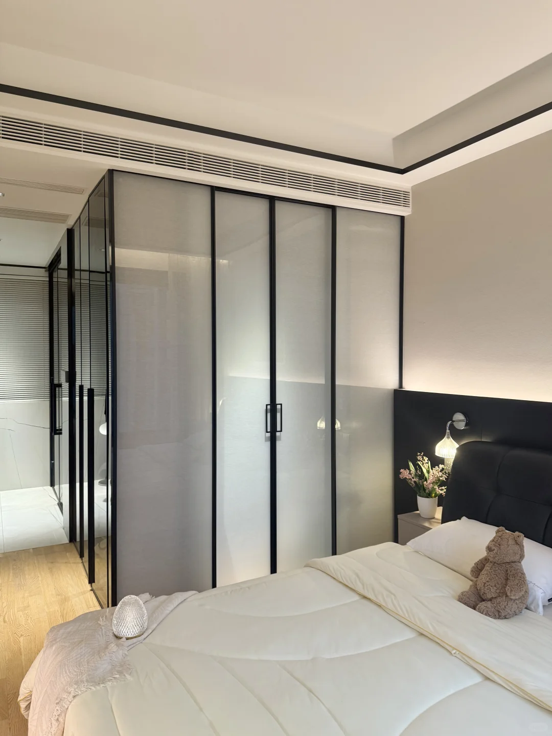 我这个卧室很小 我砸掉了没用的飘窗 做了床头护墙板床换成了储物的,床尾做悬浮桌 做了玻璃U形四面衣帽间 墙面通刷艺术漆 吊顶只做了灯槽包黑色极窄不锈钢 窗帘是麻纱搭配黑百叶。 我的卧室很简单,但真的很舒服~