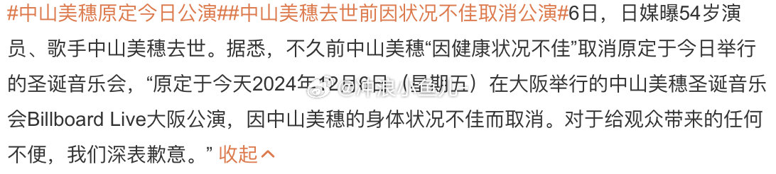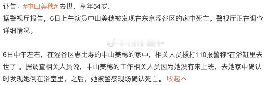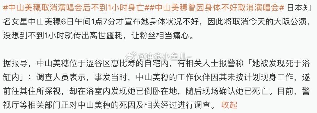 日本知名女星中山美穗,一小时前才宣布取消演唱会,一小时后就被发现死于浴缸内,如果她没有取消演唱会,当着歌迷的面去世,真不敢想象歌迷们会是怎样的心情,当然,也有可能会有另外的结局,她才54岁啊,正是闯荡歌坛的最好年纪,真的太让人痛心了