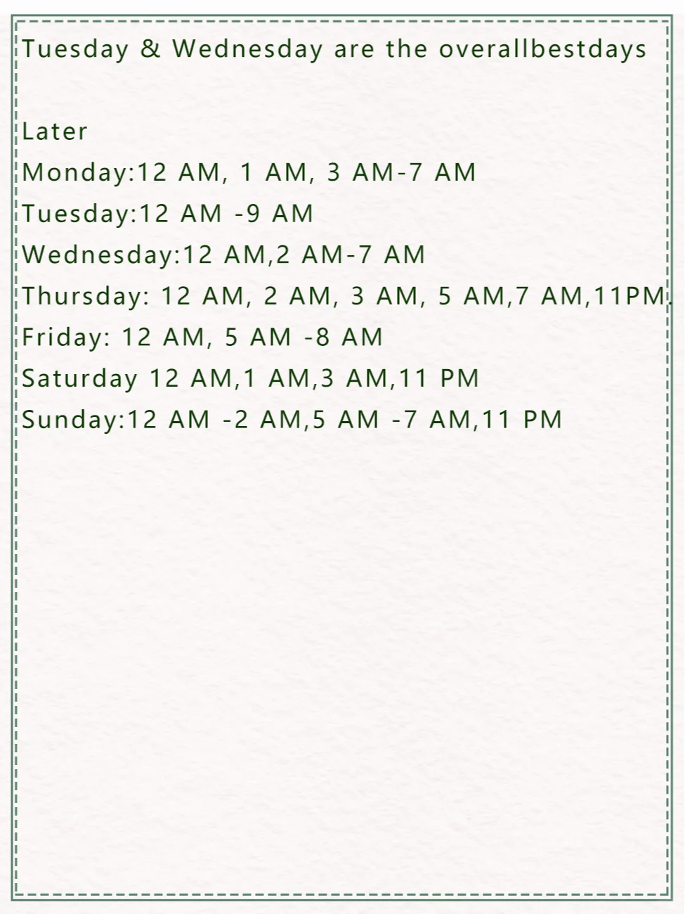 Monday:12 AM, 1 AM, 3 AM-7 AMTuesday:12 AM -9 AM