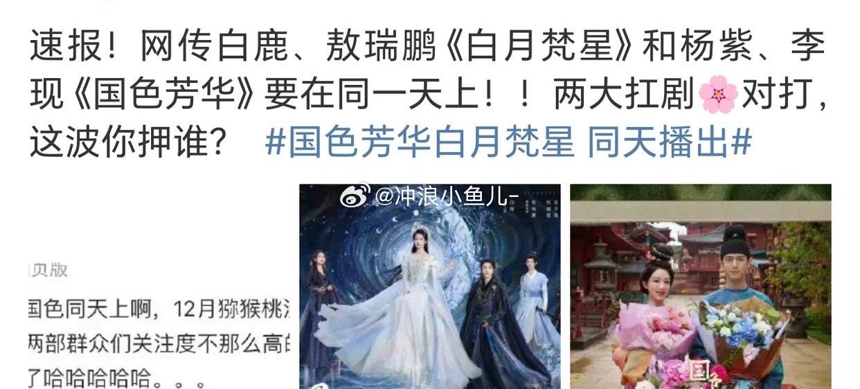 针对网传杨紫李现主演的《国色芳华》和白鹿敖瑞鹏演的《白月梵星》将在同天播出,引发热议后,网友跑去质问于正:“怎么又去碰瓷杨紫的国色芳华了,蹭个没完了。”
