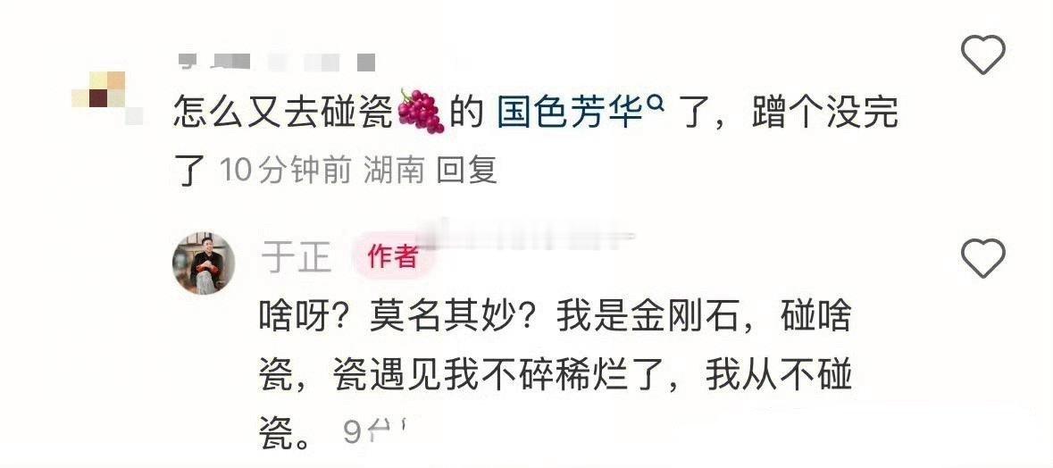 对此,于正回应:“啥呀?莫名其妙?我是金刚石,碰啥瓷,瓷遇见我不碎稀烂了,我从不碰瓷。”
