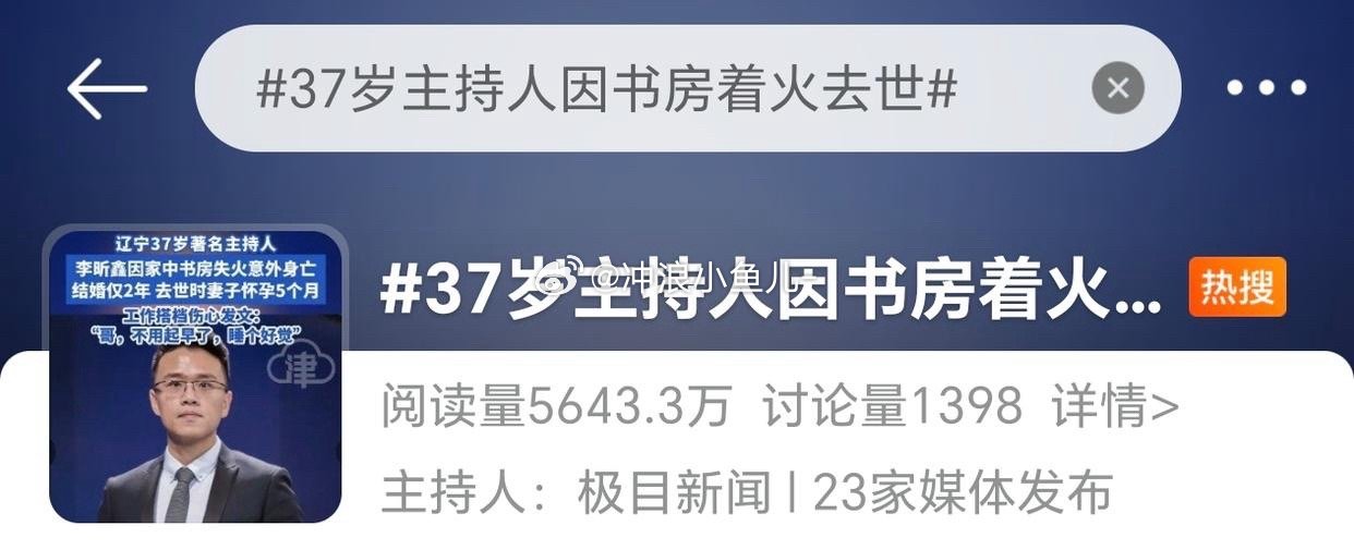 天啊!据郑州广播电视报消息,主持人李昕鑫因书房着火意外去世,年仅37岁,结婚仅两年,妻子才怀孕5个月,这也太意外了吧!9月发生的事,现在才引发热议!一路走好