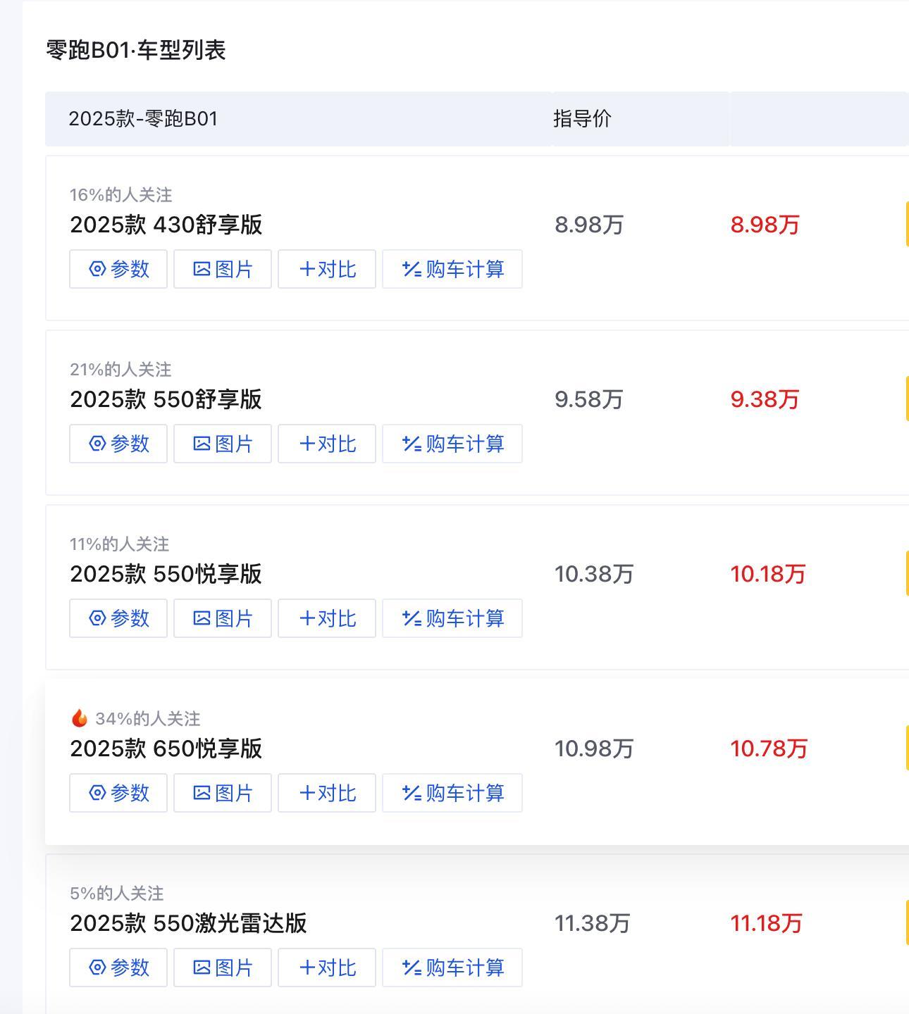 价格直降:官方指导价 8.98 万 - 11.98 万,现在限时促销后,入门版 430 舒享版 8.98 万就能拿下,550 舒享版 9.58 万,就算是顶配 650 激光雷达版,也才 11.38 万;【活动详情请咨询当地经销商】购置税补贴:即日起至 11 月 30 日完成大定并锁单,可享受跨年购置税全补贴,就算购置税政策结束后提车,零跑也直接补贴,完全不用为政策变动焦虑;交付福利:价值 880 元的交付礼包(4 个软枕、定制脚垫 + 玩偶套装),超时交付每天 50 元能量积分补贴,封顶 1000 元;【活动详情请咨询当地经销商】终身权益:整车(除易损件外)+ 三电系统终身质保,这可是长期用车的 “定心丸”。至于怎么选,给大家几个实在建议: