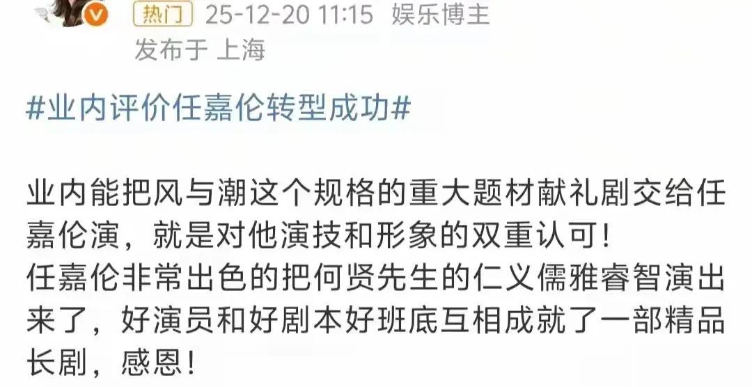 在对何贤的演绎中,任嘉伦就这样收到了来自原型一众后人们的高度认可。