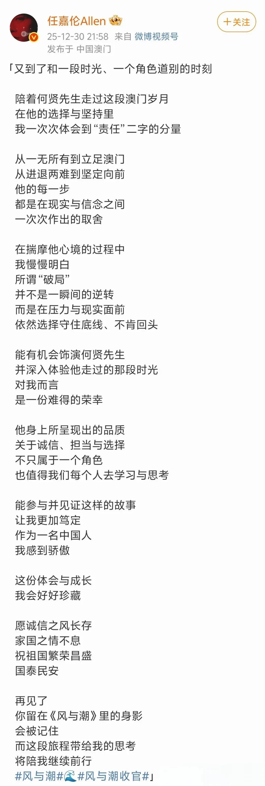 最后,附上这哥在《风与潮》收官日发布的感文: