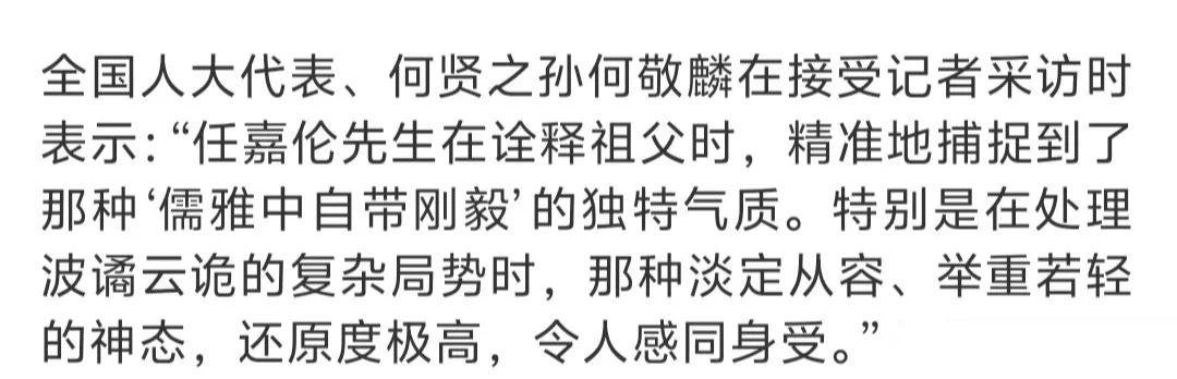 1月2号,光明日报发布了一则何敬麟的近期采访,传达了何贤后人对任嘉伦的高度认可。