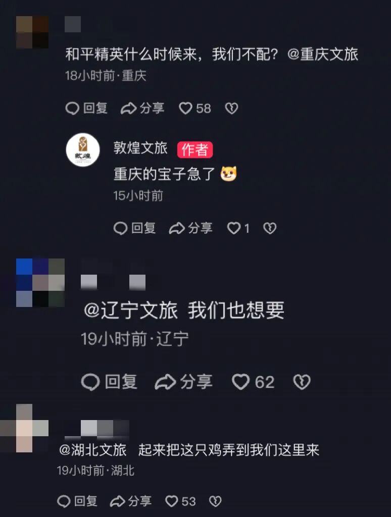 敦煌文旅在抖音发布的联动视频下,网友就纷纷在评论区艾特各路文旅,直呼“我们也想要”“起来把这只鸡弄到我们这里来”“和平精英什么时候来”,可见此次《和平精英》与敦煌文旅的花式整活,确实极受年轻人喜欢。