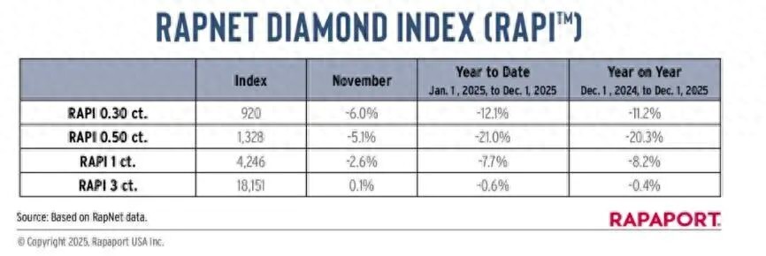 戴比尔斯此次降价,源于全球钻石市场需求下滑后带来的价格下跌。据RapNet 钻石价格指数(RAPI)显示,2025年,3克拉以上钻石RAPI微跌0.4%;0.3-0.5克拉等小颗粒日常消费级钻石,受培育钻石冲击和需求疲软影响,价格跌幅显著,2025年0.5克拉钻石全年跌幅超过20%。